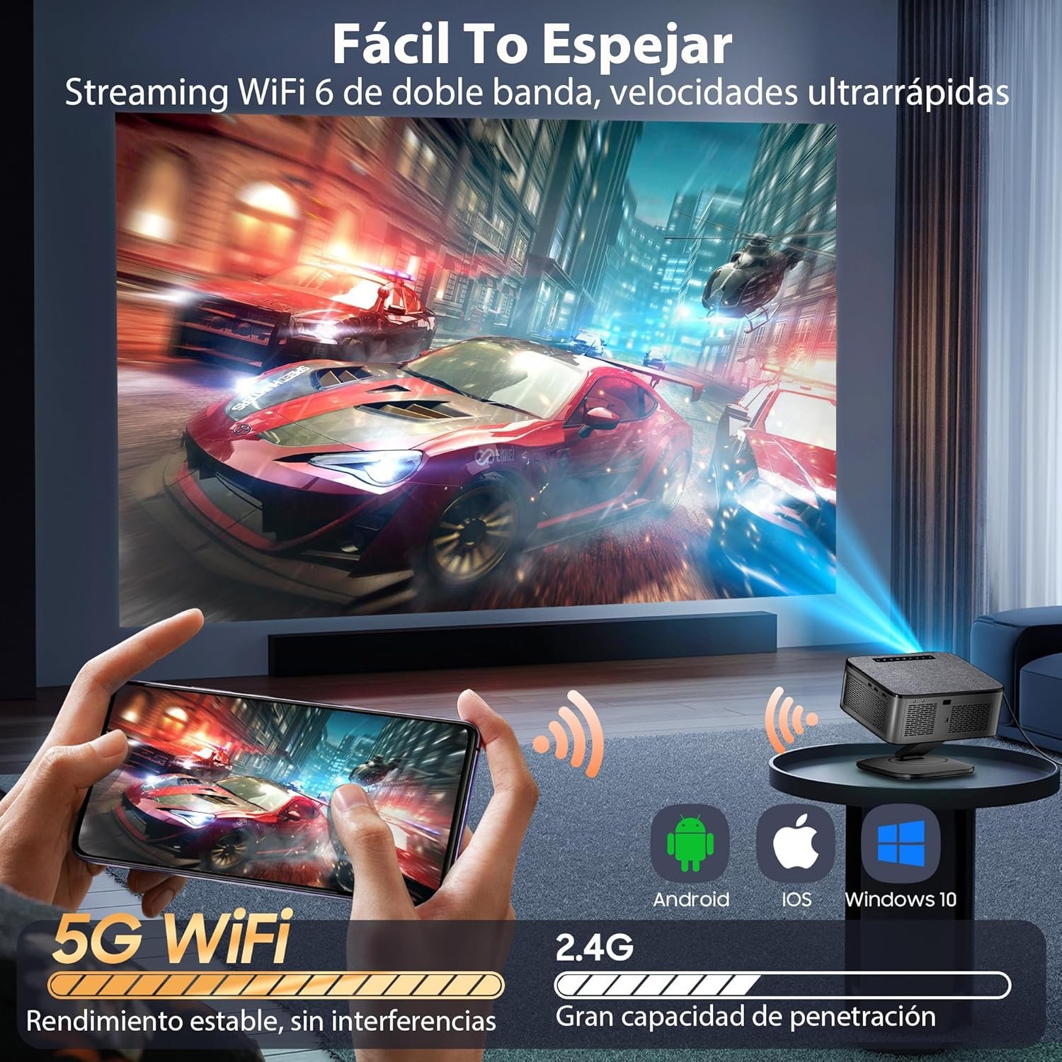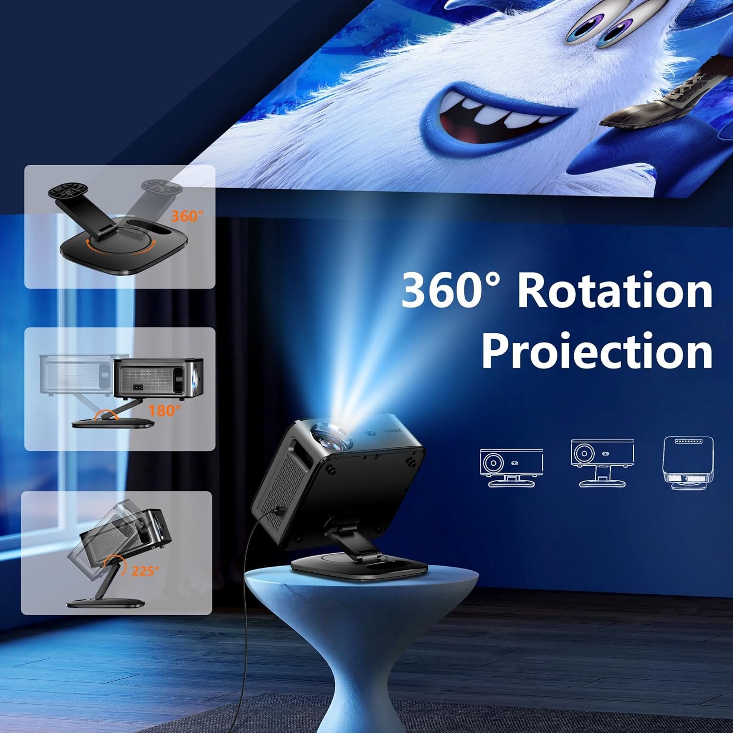 【Soporte plegable y extraíble único de 360°】El soporte giratorio de 360° ofrece más versatilidad que el estándar de 180°. El proyector wifi XIWBSY cuenta con un soporte exclusivo extraíble y plegable para una proyección flexible en la pared o el techo, lo que permite una visualización cómoda en cualquier ángulo manteniendo la estabilidad. Perfecto para disfrutar de una noche de cine con familiares y amigos en cualquier momento y lugar.