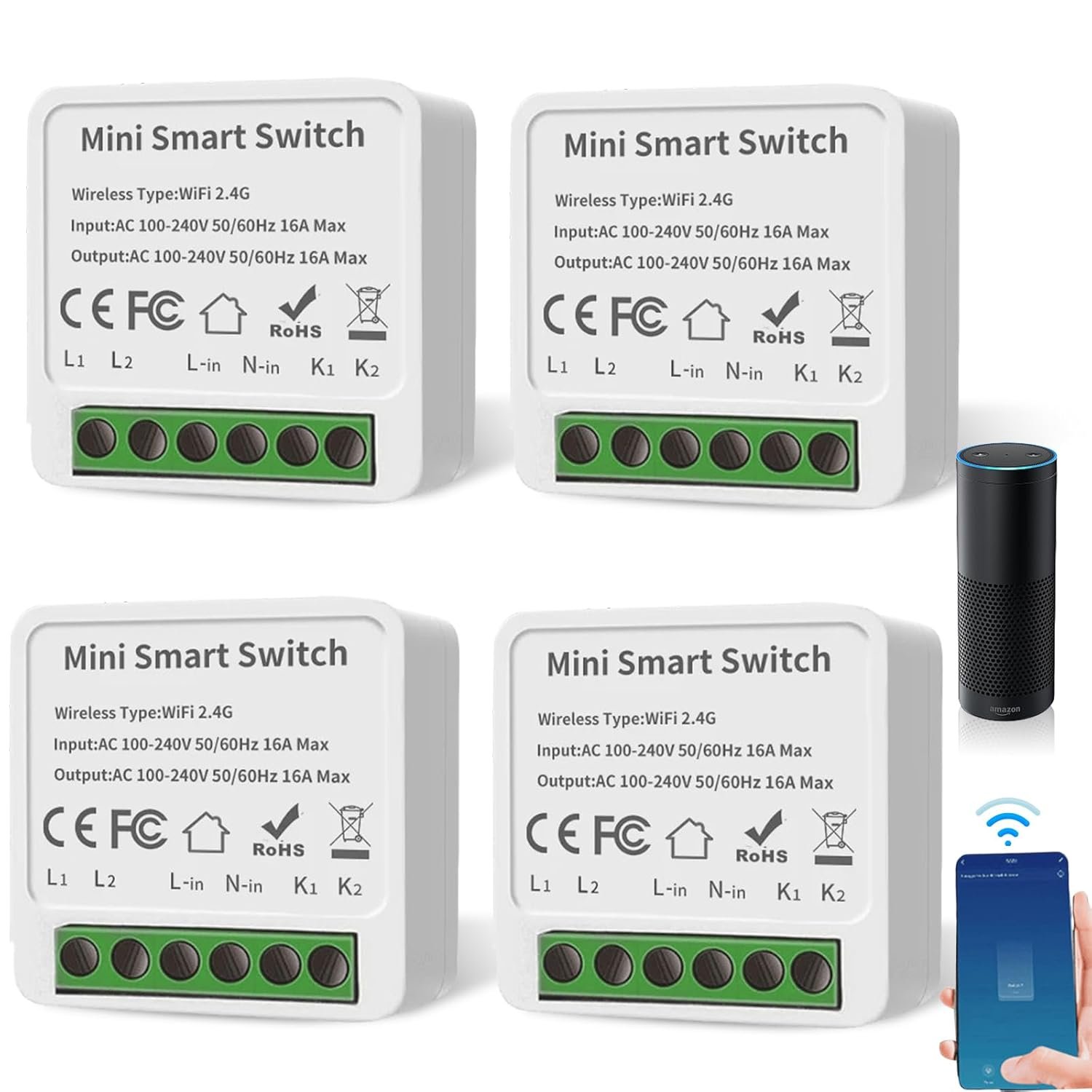 Características: – El interruptor de luz inteligente WiFi es compatible con Alexa y el Asistente de Google para administrar sus dispositivos de conmutación por voz. -Puedes controlar el interruptor de luz inteligente en cualquier momento y en cualquier lugar a través de la aplicación Smart Life/Tuya. -Este mini módulo de interruptor inteligente conecta dos interruptores de transmisión a través de un cableado, permitiendo que dos interruptores controlen una luz al mismo tiempo. Presupuesto: Tamaño: 4x4x2cm. Entrada y salida: CA 100-240 V, 50/60 Hz Color: blanco. Material de la carcasa: PC ignífugo Método de cableado: línea de corriente cero Tipo de interruptor: Botón Paquete 4 x módulos de interruptor de luz inteligente