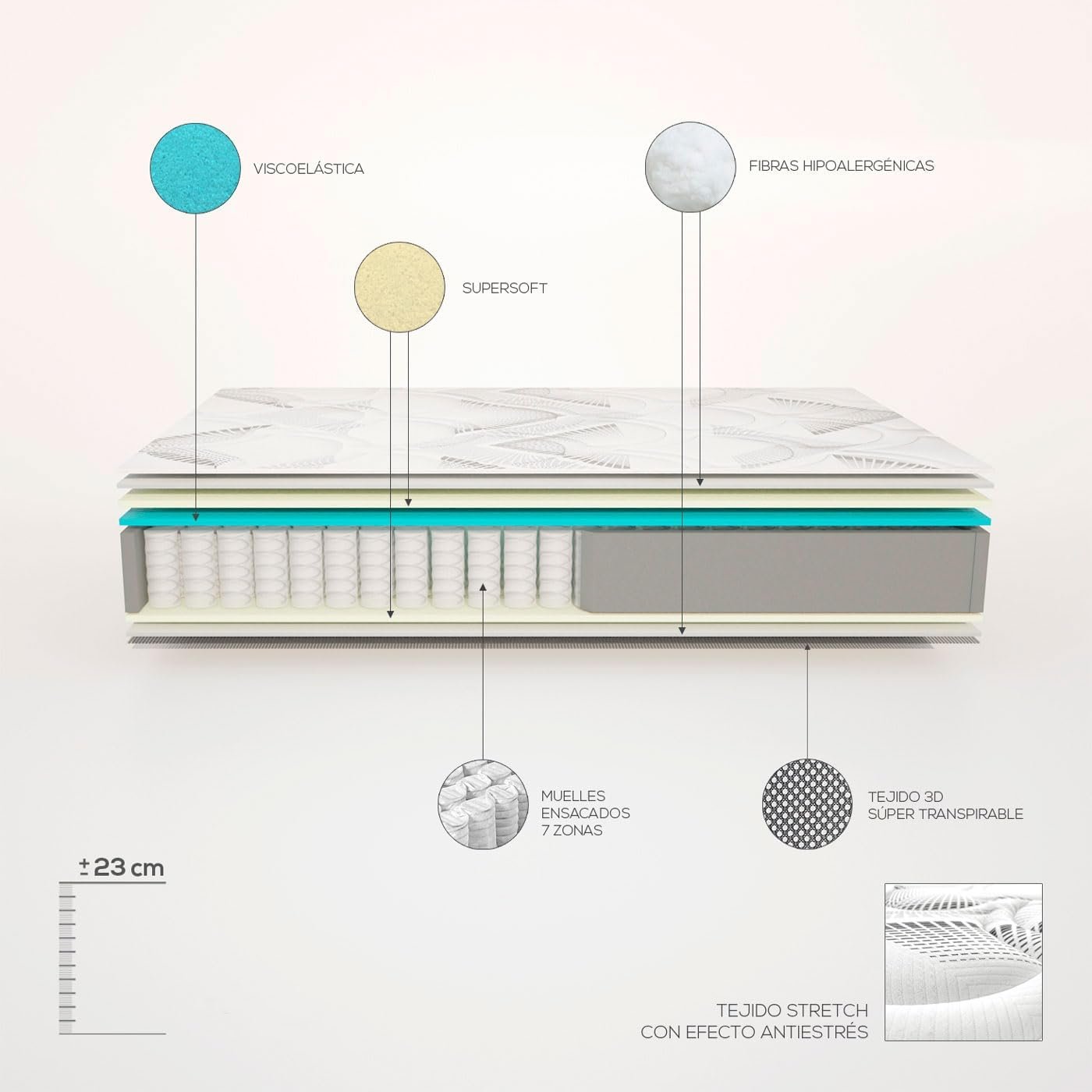 La tecnología del núcleo de muelles ensacados con 7 zonas de dormir, proporciona independencia de camas, para que no notemos los movimientos del otro durmiente. El lateral del colchón está confeccionado con banda de tejido súper transpirable, aportando mayor aireación al colchón.