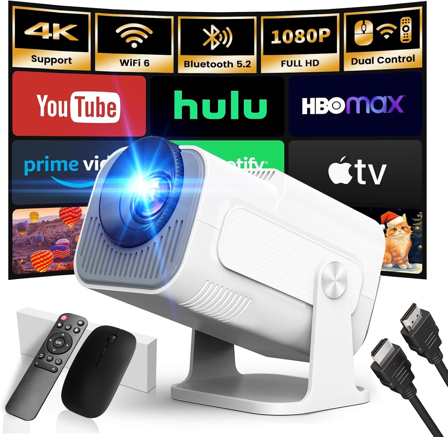 (Aplicación incorporada) Proyector portátil actualizado 2025 1920x1080P 4K Supote Video Proyector Control dual TV WiFi 6 BT5.2 Rotación de 180° Compatible con HDMI/TV Stick/USB/Laptop, Blanco