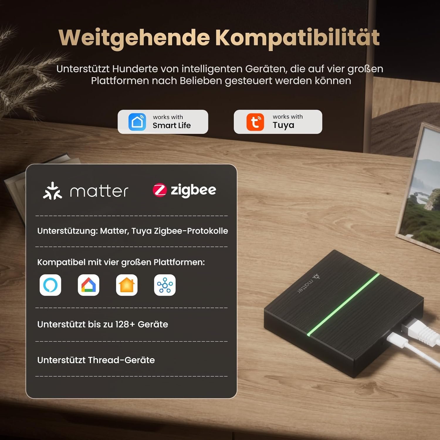 MULTIFUNCIONAL: gracias al material, el tapete GW60 es un concentrador versátil que admite dispositivos Tuya Zigbee y Matter Thread, donde se pueden agregar hasta 128 dispositivos Tuya Zigbee/Matte Thread. Como puente mate, permite que todos los dispositivos Tuya Zigbee agregados al Hub se conecten a la red Matter.