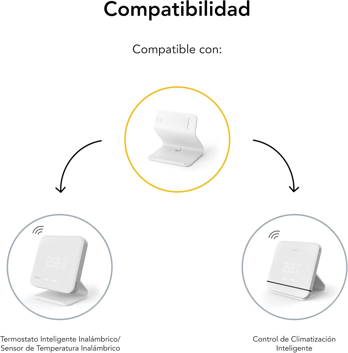 La base de tado° te permite colocar tu Termostato Inalámbrico, Sensor de Temperatura Inalámbrico o Control Inteligente de Clima y Bomba de Calor en cualquier superficie. – Diseño simple – Fácil instalación – Fijación segura Para obtener mejores resultados, le recomendamos que coloque la base donde mejor pueda medir la temperatura ambiente. Montaje: El Termostato Inteligente Inalámbrico y el Sensor de Temperatura Inalámbrico se fijan a la base con los dos tornillos incluidos en la caja. Smart Climate Control está asegurado gracias a la muesca situada en la parte inferior de la base. Para darle estabilidad, el cable de alimentación está fijado en la ranura de la parte posterior. No se necesitan tornillos. Para la instalación, utilice el cable de alimentación recibido con el Control de Clima Inteligente. Compatible con termostato inteligente inalámbrico, sensor de temperatura inalámbrico y control inteligente de clima y bomba de calor Coloca tu dispositivo tado° sobre una mesa o cualquier otra superficie, sin necesidad de fijarlo a la pared, fácil instalación y sin necesidad de taladrar Si utilizas tado° para calentar, mide la temperatura donde más te convenga, en lugar de tener que hacerlo directamente en la fuente de calor (por ejemplo, un radiador). Diseño elegante y duradero adaptado a tu dispositivo tado° Contenido de la caja: 1 x base, 2 x tornillos, 1 x guía del usuario