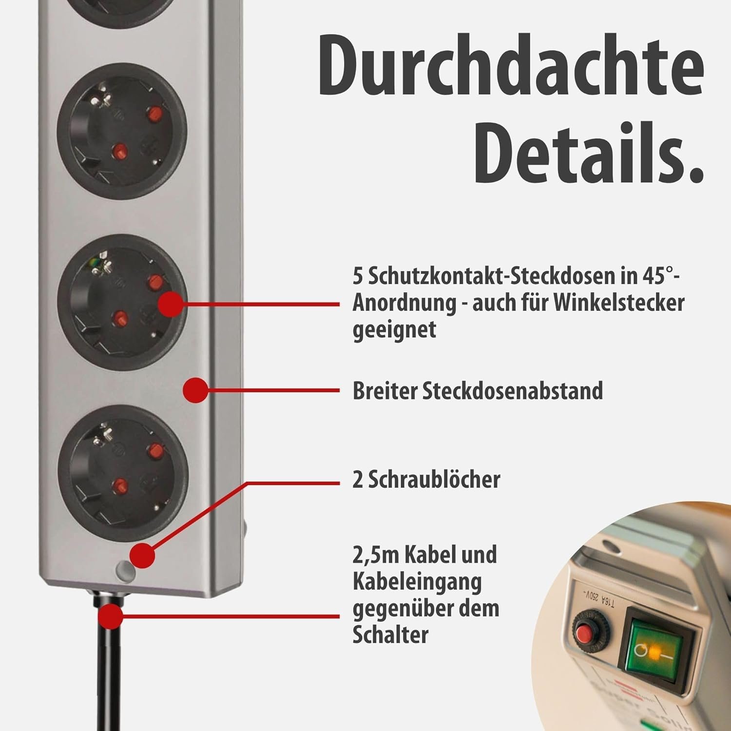 Multiconector con cable de 2,5 m (H05VV-F 3G1,5) y 5 enchufes con conexión a tierra, colocados en una disposición de 45°: la disposición de los enchufes y la distancia entre los enchufes permite conectar enchufes en ángulo y cargadores de gran tamaño Protege equipos valiosos de sobretensiones con una corriente de fuga máxima de hasta 13.500A (protección durante tormentas, rayos, etc.) Regleta de enchufes con protección contra contactos accidentales integrada: pequeñas placas de plástico cierran los contactos de salida Base de enchufe múltiple montable, posible instalación y fijación, con carcasa estable e interruptor de seguridad iluminado para encendido/apagado (bipolar) Regleta súper sólida con luz indicadora LED – Indicación de luz LED mediante protección activa contra sobretensión