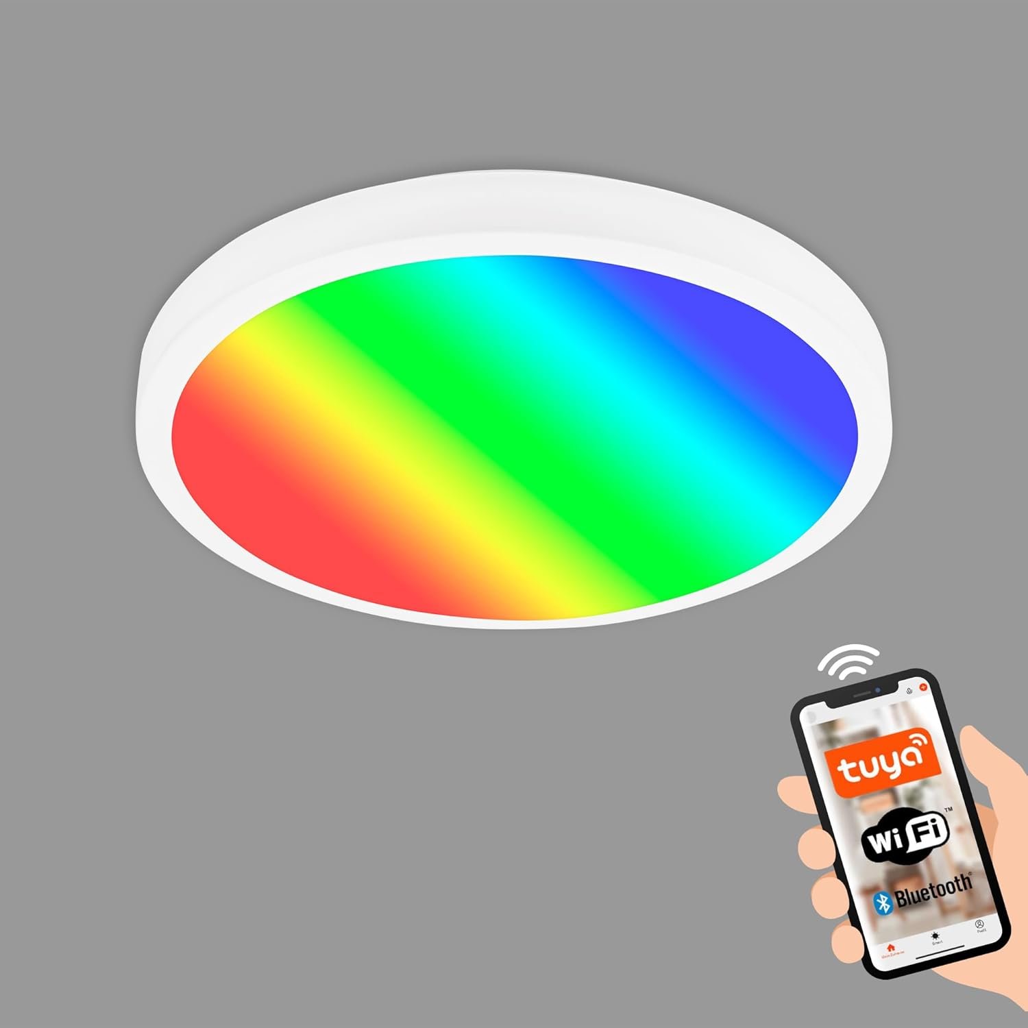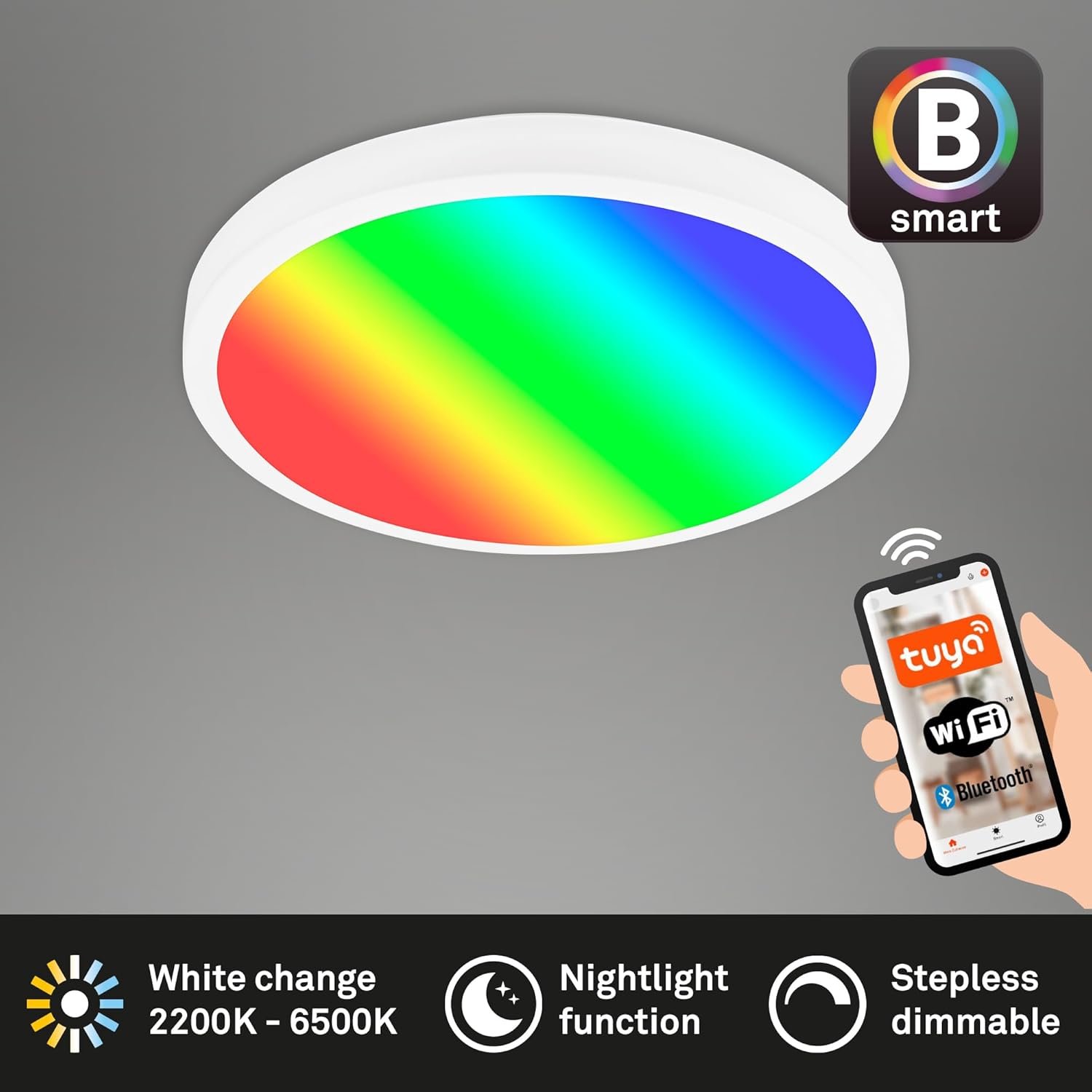 Infinidad de posibilidades: la lámpara de techo inteligente de 20 W se puede controlar mediante un smartphone y también mediante control por voz con los asistentes de voz habituales. Produce colores de luz llamativos con cambios de color, tiene una temperatura de color ajustable (de blanco cálido a blanco frío) y es regulable de forma continua