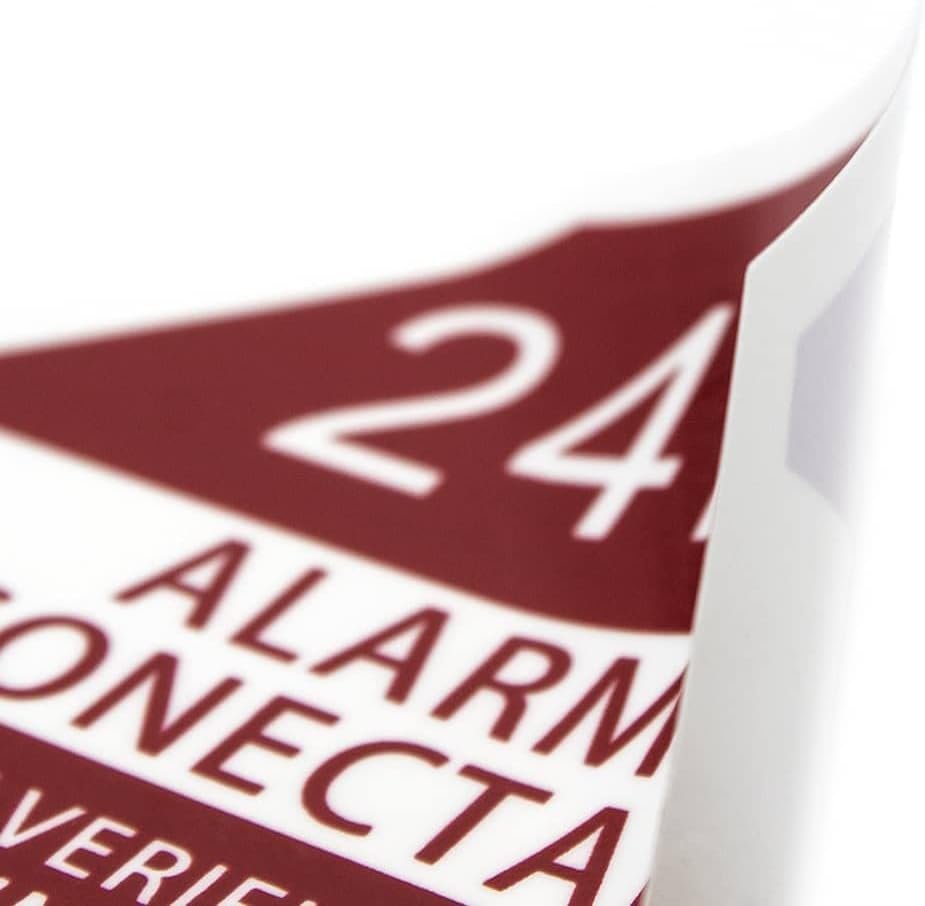 Esta Pegatina de Alarma Conectada puede utilizarse en exteriores e interiores, gracias a su material de fabricación, resistente a la humedad, lluvias, cambios de temperaturas, etc.