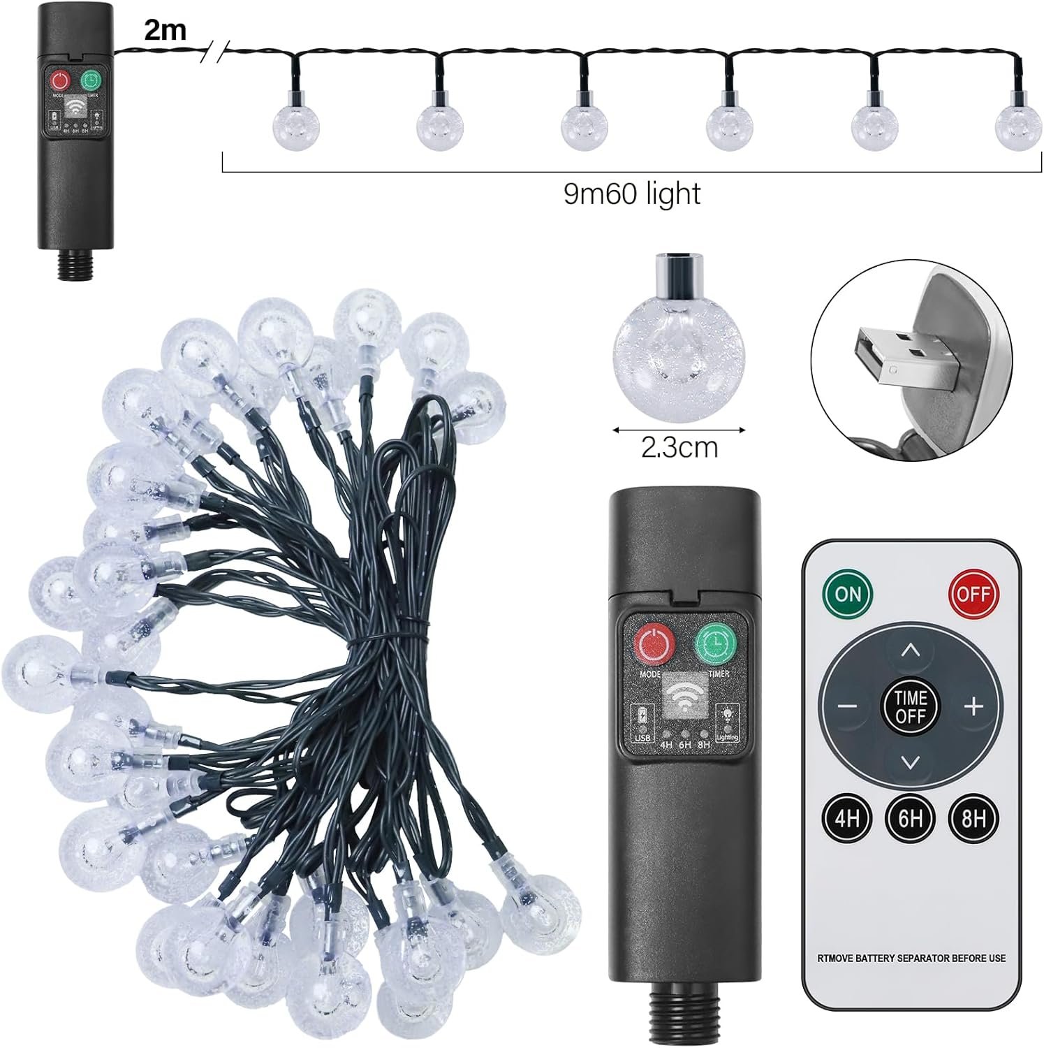 60 luces LED de bola de cristal de alta calidad, longitud de lámpara de 9 m y cable de 2 m, con una longitud total de 11 metros. Se pueden instalar fácilmente en cualquier lugar del jardín, patio, jardín, árboles, cenadores, cercas, bodas, barbacoas o como decoración al aire libre, para crear un ambiente veraniego y alegre.