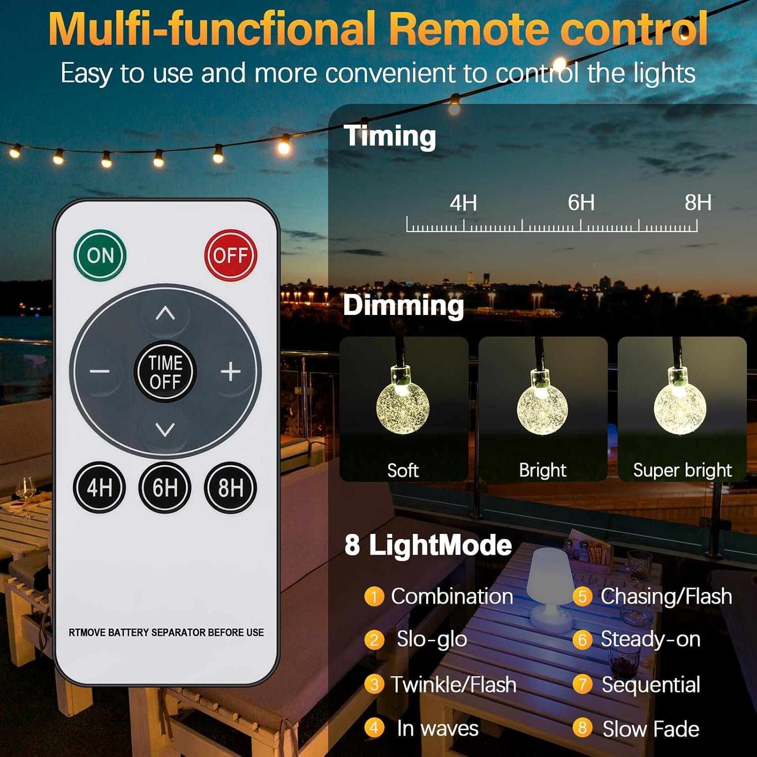 【8 modos de iluminación】La cadena de luces de bolas de cristal ofrece 8 modos de iluminación diferentes. Con el botón de modo del mando a distancia, podrás cambiar fácilmente entre ellos y disfrutar de diferentes atmósferas románticas. La cadena de luces solares cuenta con un chip de memoria incorporado que recuerda el último modo de iluminación seleccionado, por lo que no es necesario reiniciarlo.