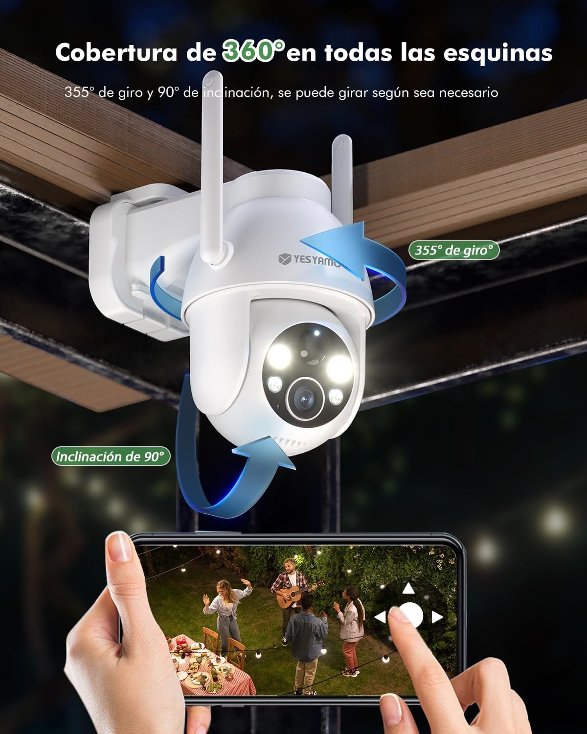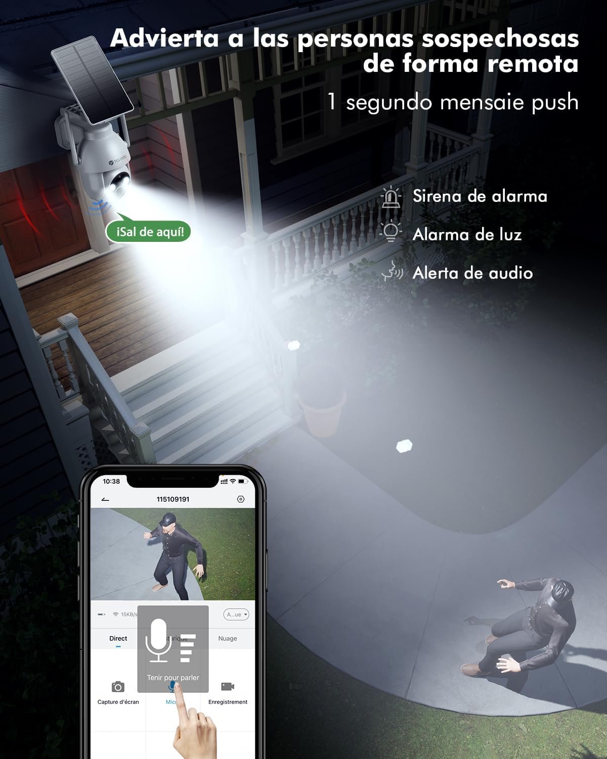 Cámara de Vigilancia Solar WiFi Exterior 2K con Batería, Panel Solar, Cámara Solar Exterior WiFi 2.4GHz IP66, PTZ 360°, Visión Nocturna Color, Audio Bidireccional, Sirena PIR, Blanco