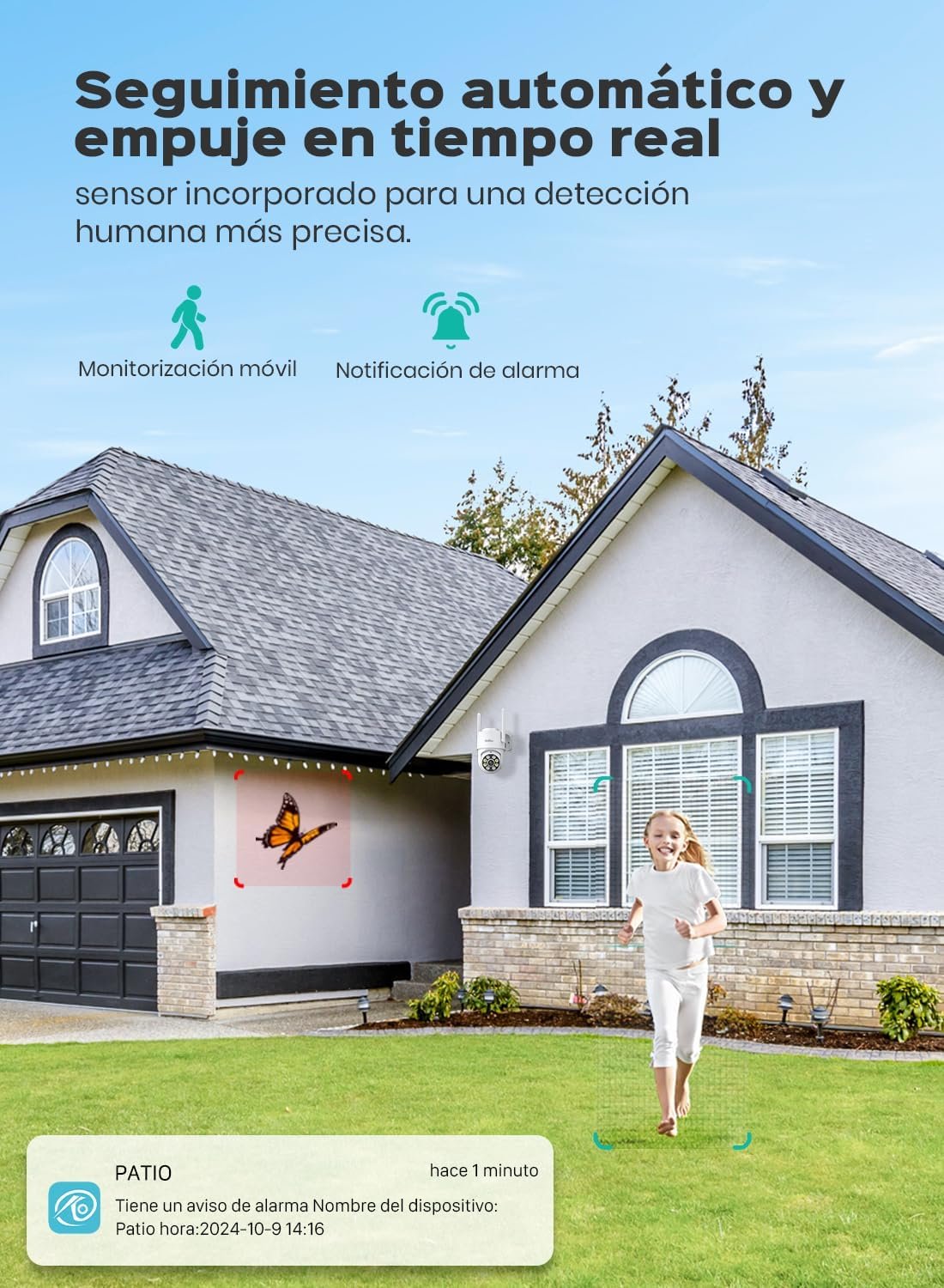 Detección AI y protección activa: la cámara de vigilancia está equipada con una sirena. Cuando la cámara de vigilancia exterior detecta movimiento, graba un vídeo de alarma y hace parpadear los LED con una señal sonora para ahuyentar a los intrusos. Al mismo tiempo, la cámara de vigilancia exterior envía una notificación en tiempo real a tu móvil en tan solo 0,2 segundos.