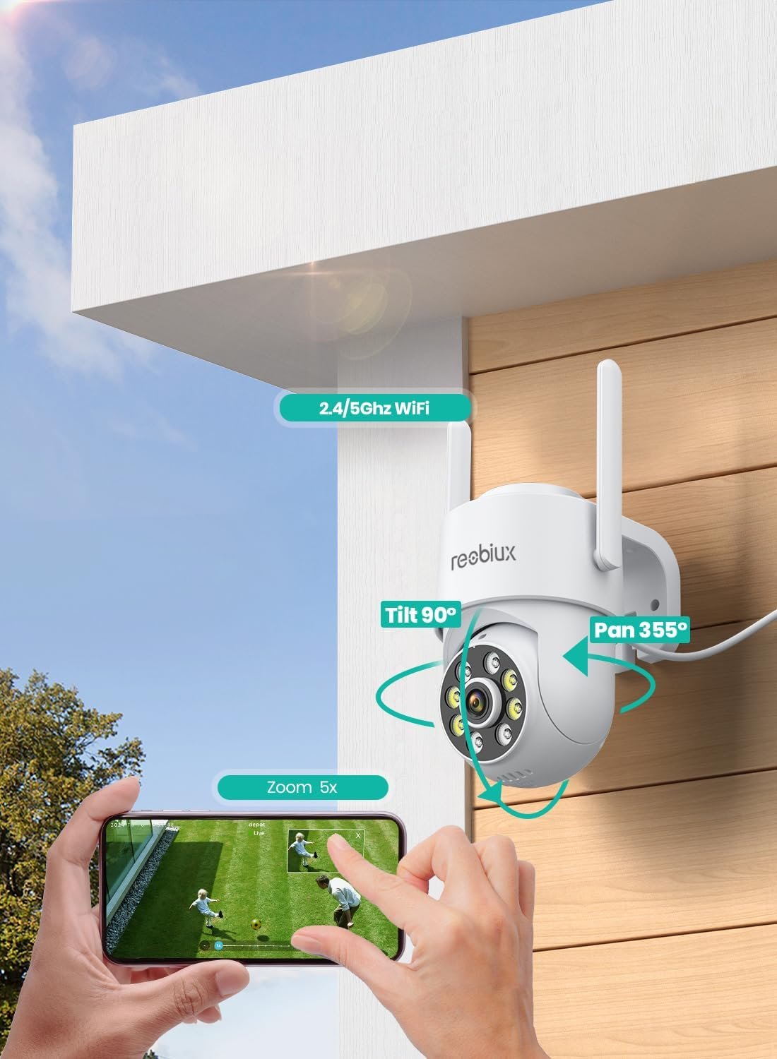 1080P HD y visión nocturna en color: la cámara de vigilancia WiFi para exteriores está equipada con un sensor de 2 MP que ofrece imágenes nítidas. Esta cámara cuenta con 8 LED blancos que permiten una visión nocturna en color de hasta 30 metros. Además, la cámara de vigilancia WiFi para interiores admite cuatro modos de visión nocturna: color, infrarrojos, inteligente y apagado. Esta cámara de vigilancia doméstica WiFi también es compatible con WiFi de doble banda 2,4 GHz