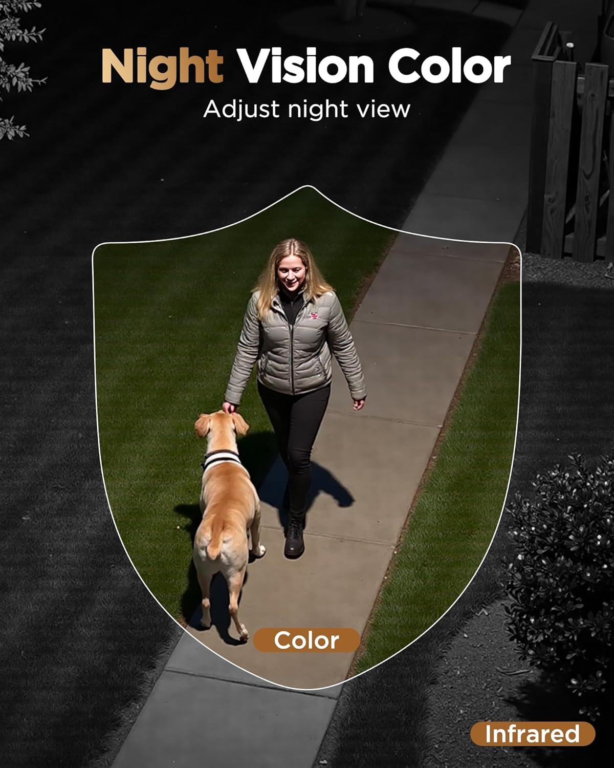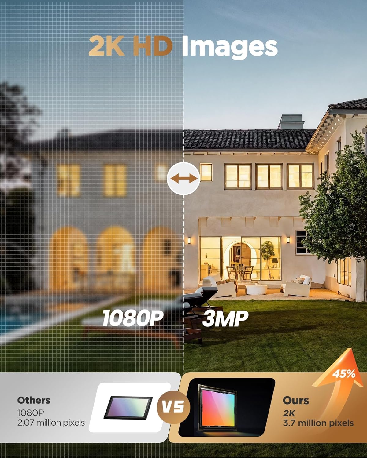 【Resolución 2K y manténgase alejado del mosaico】Estas cámaras de seguridad inalámbricas para exteriores equipadas con la última tecnología de resolución 2K mejoran aún más el efecto visual de la cámara. En comparación con un mosaico de pantalla completa, es más probable que vea videos claros de esta cámara de seguridad para exteriores, lo que le brinda una experiencia de usuario diferente. Ya sea observar animales pequeños o encontrar invasores, es más fácil. Bonito sistema de cámaras de seguridad.