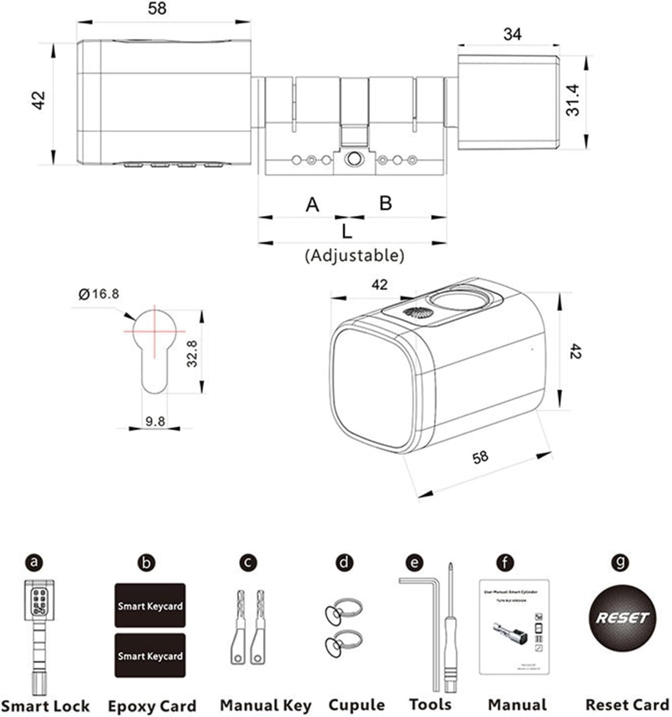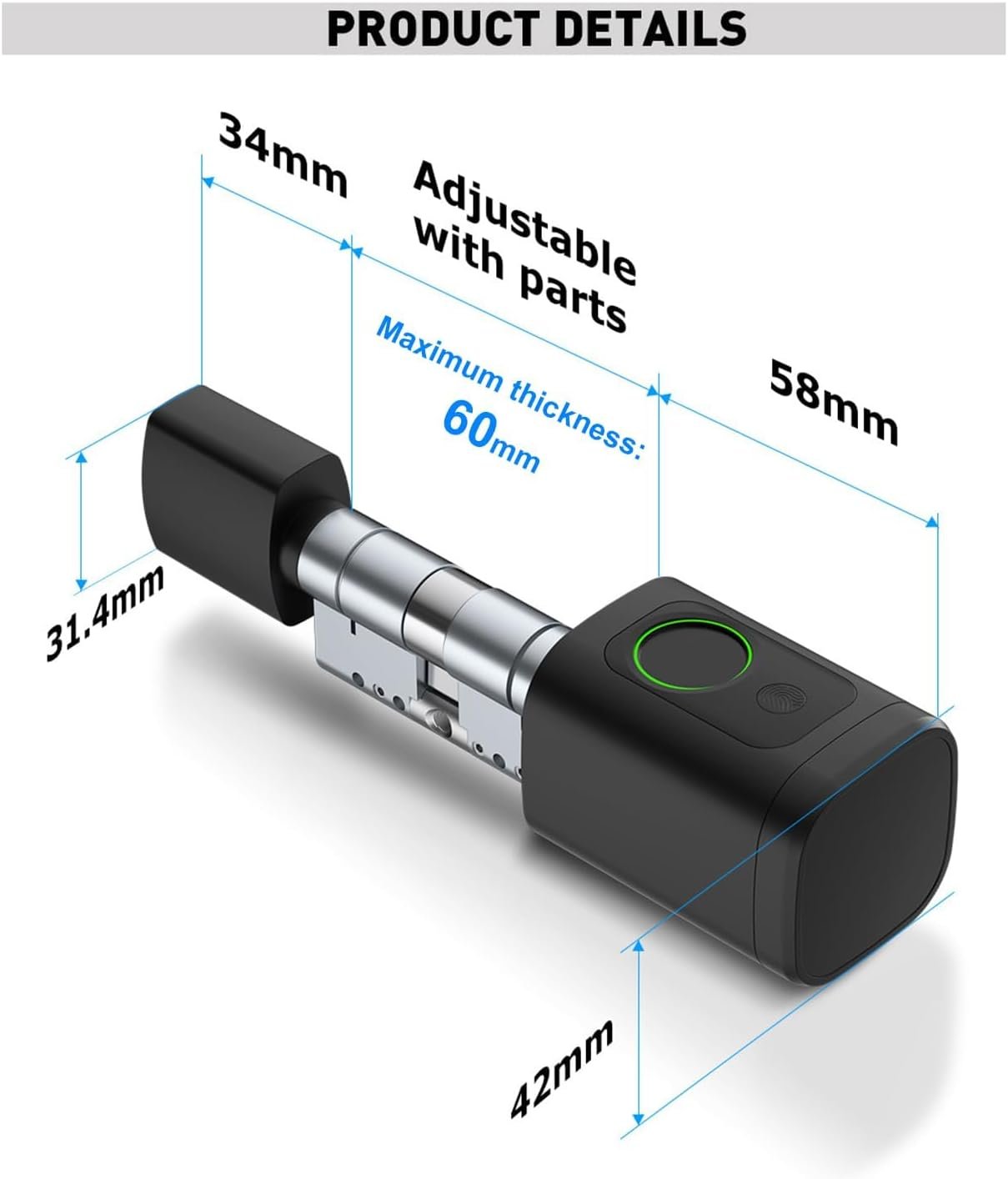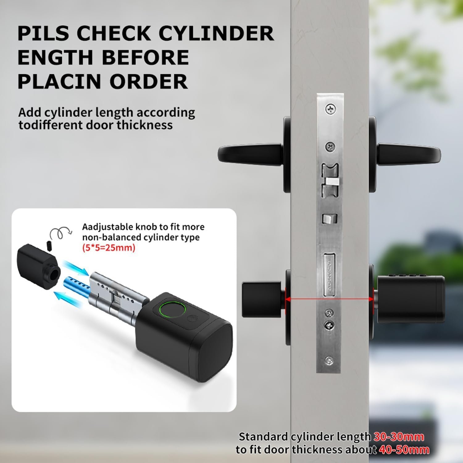 【CÓMODA CERRADURA DE PUERTA INTELIGENTE】 La cerradura de huella digital reemplaza el cilindro de una cerradura mecánica. No es necesario taladrar y puedes instalarlo tú mismo en 5 a 10 minutos. La cerradura de huella digital es adecuada para puertas de 35 a 50 mm de espesor.