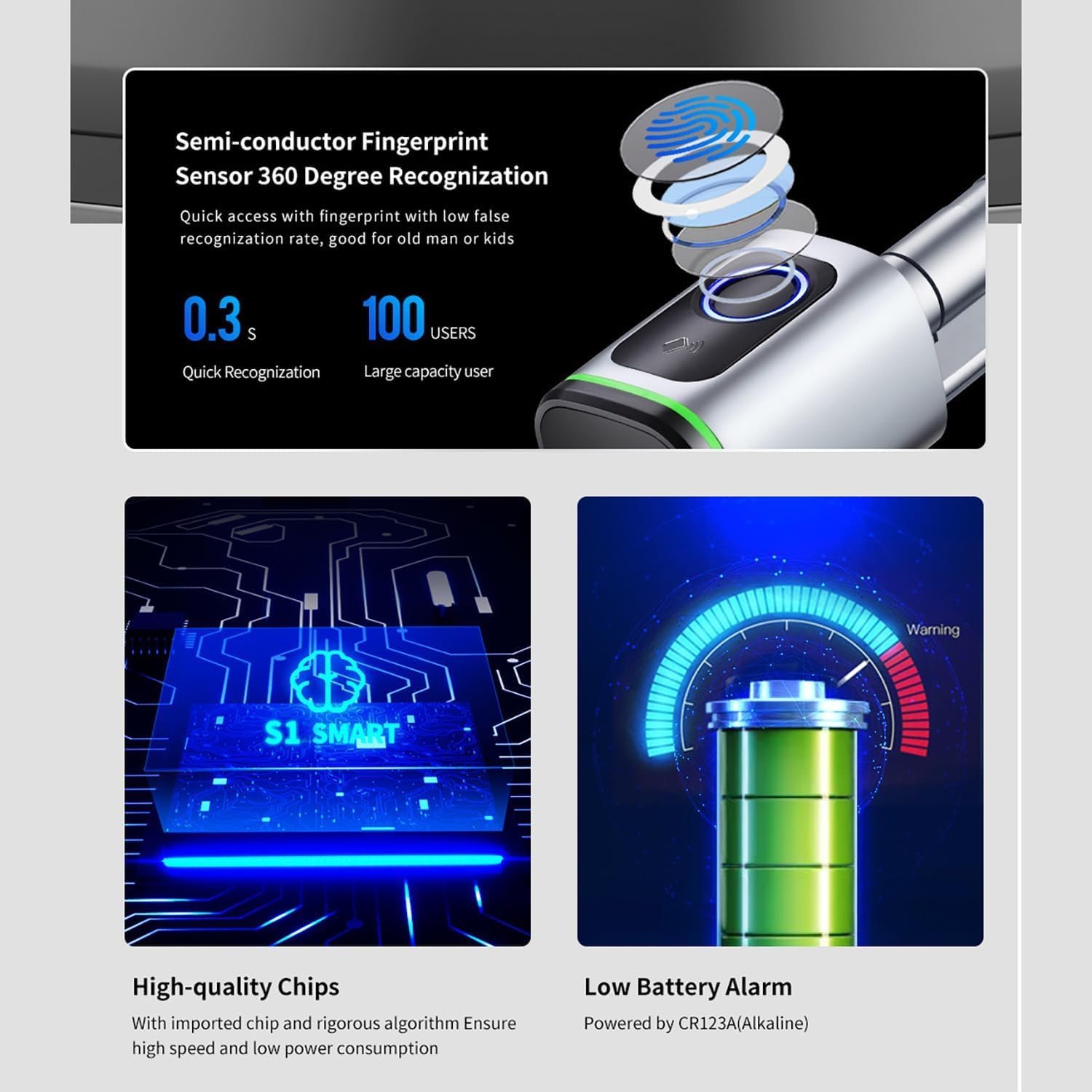 La cerradura electrónica le permite abrir la puerta fácilmente con su huella digital, lo cual es conveniente y seguro. Se pueden almacenar hasta 100 huellas dactilares (3 de ellas con función de gestión). Si la batería se agota, el cilindro de la cerradura electrónica se puede desbloquear mediante el cable de datos.