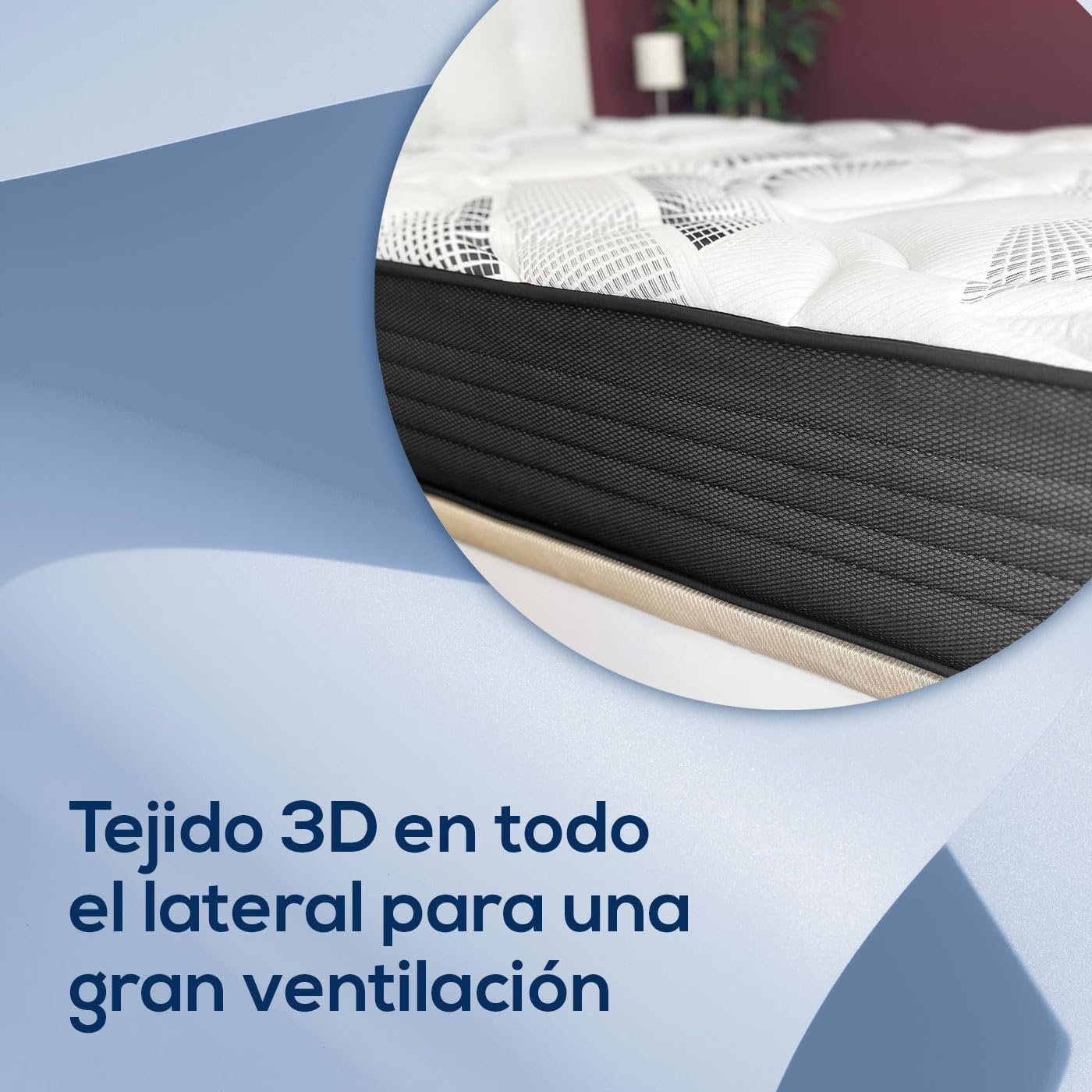 La tecnología del núcleo de muelles ensacados con 7 zonas de dormir, proporciona independencia de camas, para que no notemos los movimientos del otro durmiente. El lateral del colchón está confeccionado con banda de tejido súper transpirable, aportando mayor aireación al colchón.