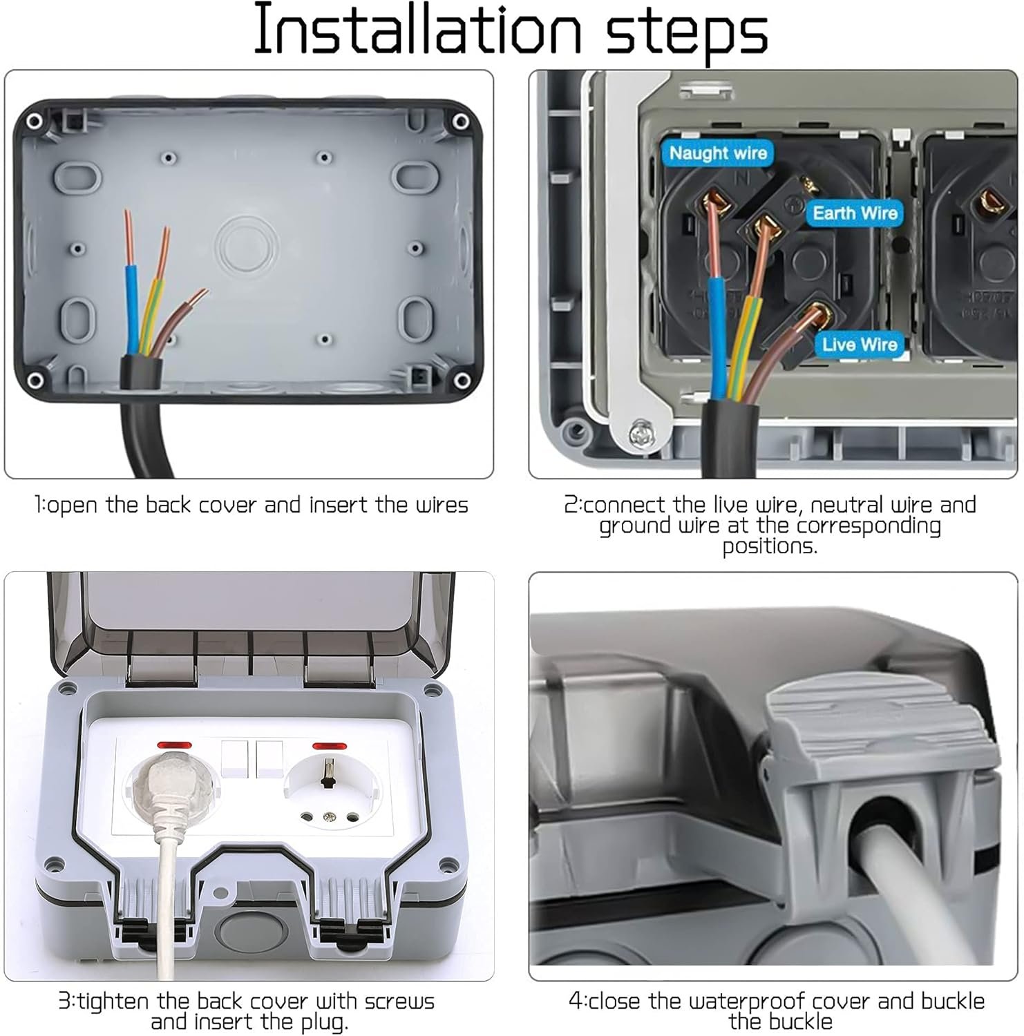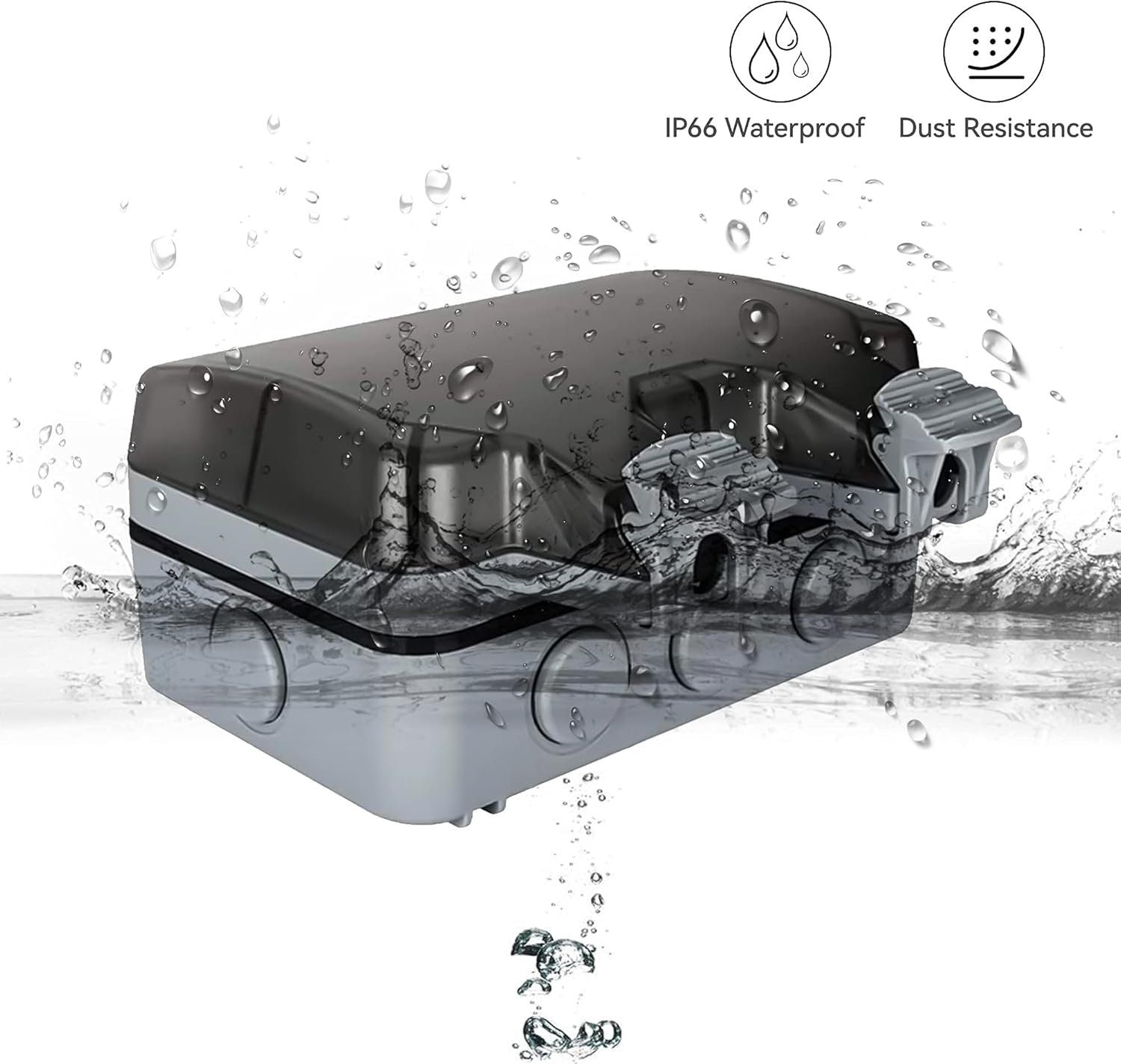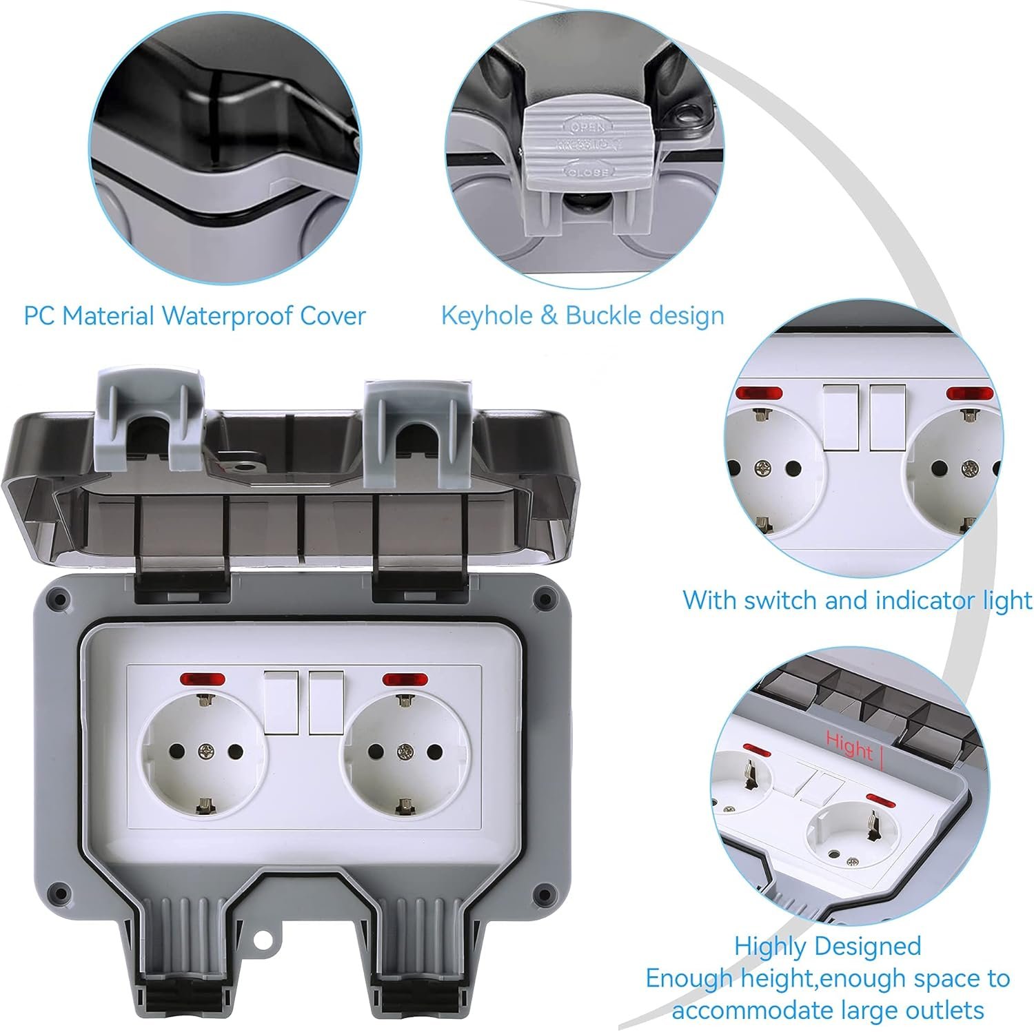 (Material) El tapón impermeable hecho de material ABS es duradero y ofrece protección contra explosiones y polvo. No se agrietará ni se desvanecerá. (Seguro) El anillo de sellado del tapón impermeable está hecho de goma, puede prevenir eficazmente la entrada de agua y polvo. El voltaje nominal es de 220 V-250 V, la corriente nominal es de 16 A. (Enchufe exterior IP66) Enchufe IP66, resistente al agua y al polvo, ideal para enchufes exteriores. (Conveniente) La versión mejorada del socket. Puede controlar el interruptor con solo tocar un dedo, fácil de desmontar e instalar. (Accesorios Completos) 4 tornillos, 4 fundas de goma negras impermeables, 4 membranas impermeables grises, dos interruptores táctiles.