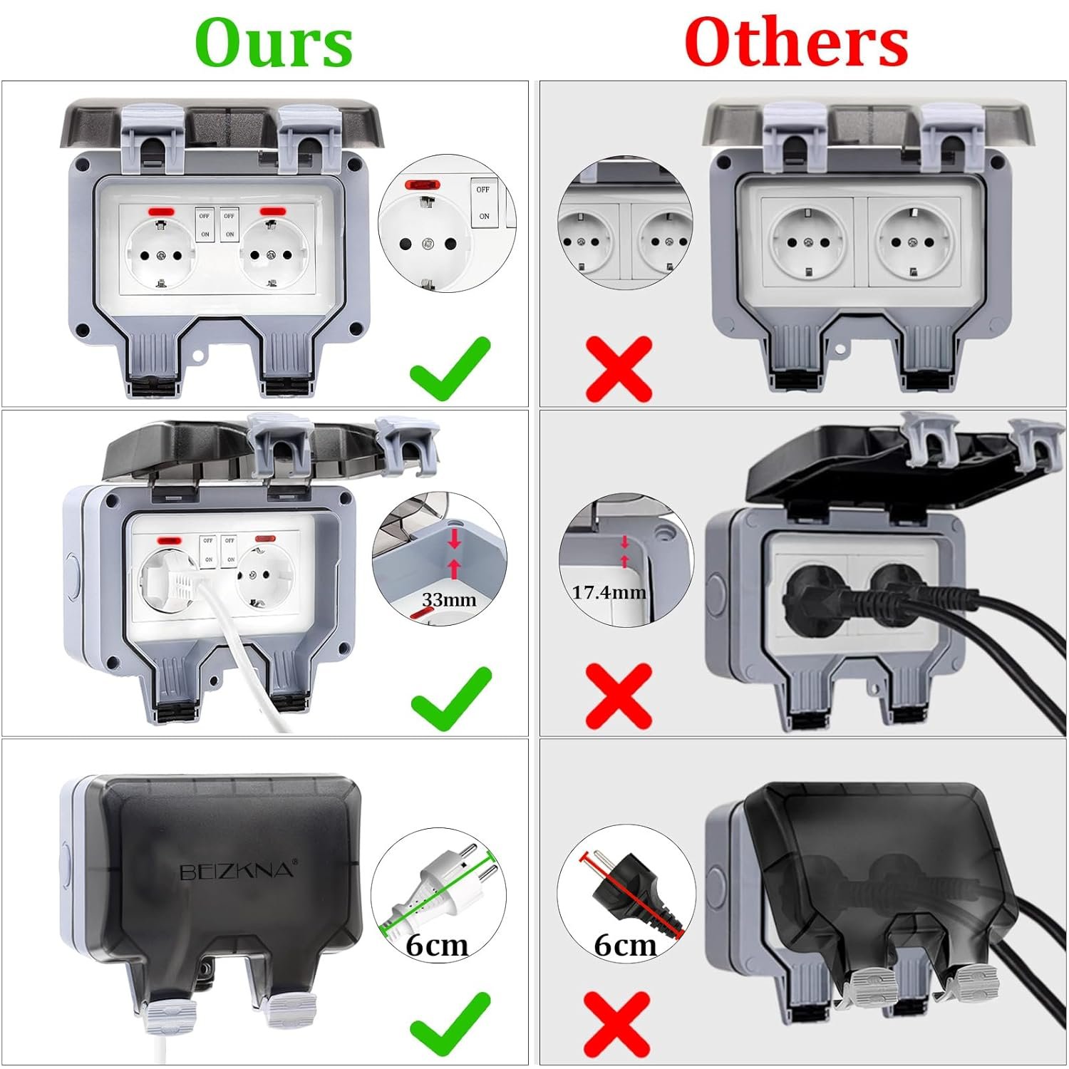 【Enchufe exterior impermeable IP66】 Diseño cerrado con cubierta, clasificación IP66, que es totalmente impermeable y a prueba de polvo. Uso en habitaciones húmedas o zonas exteriores protegidas. El diseño de 2″ de profundidad proporciona suficiente espacio para que los tapones de diferentes formas cierren la tapa fácilmente.