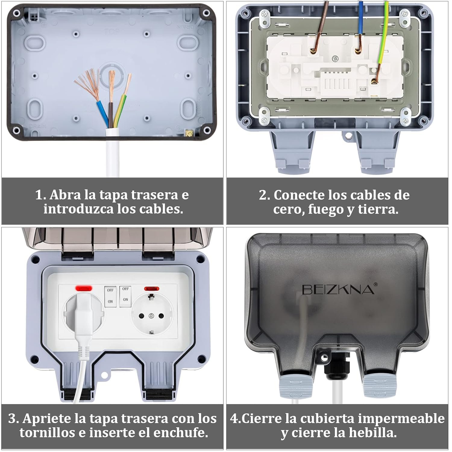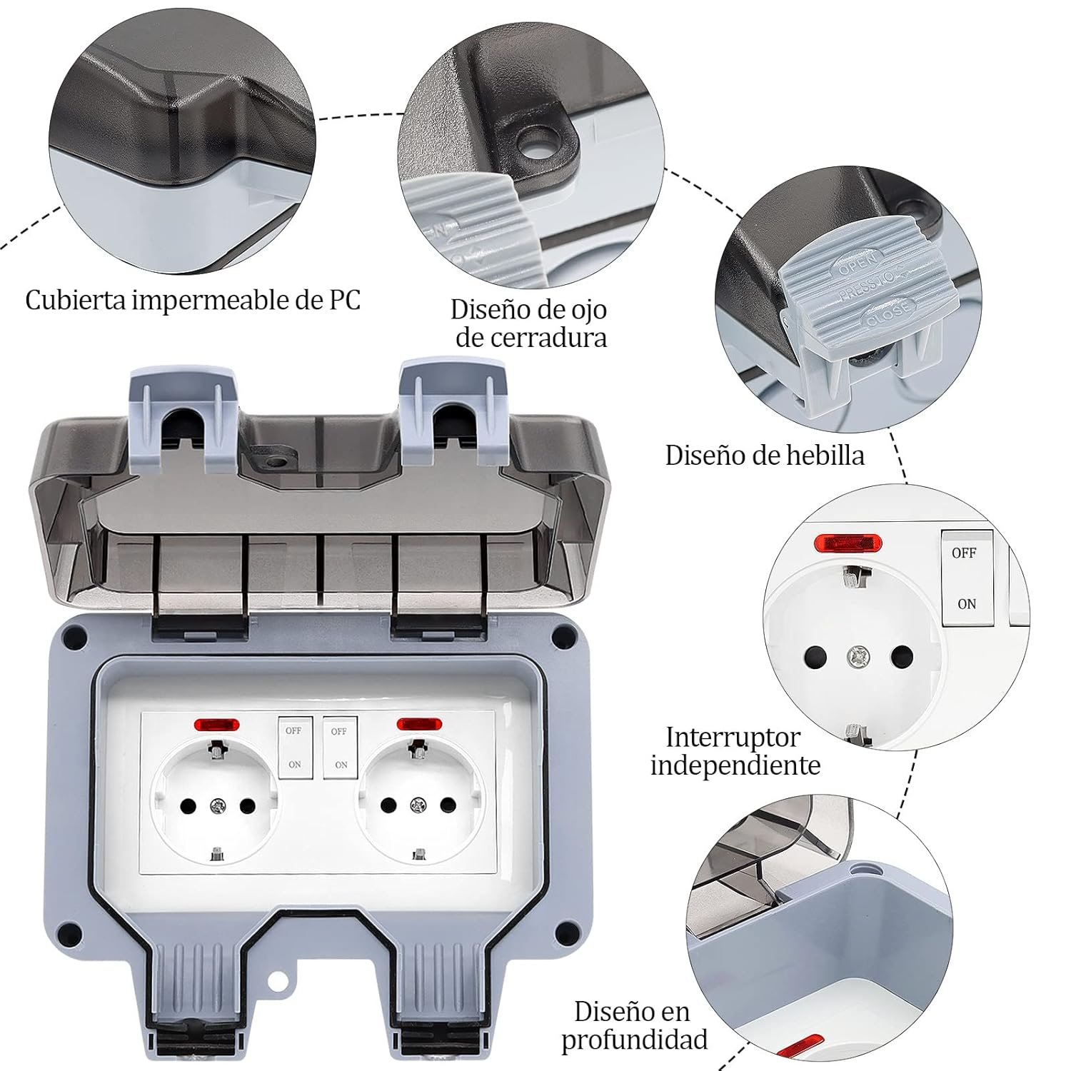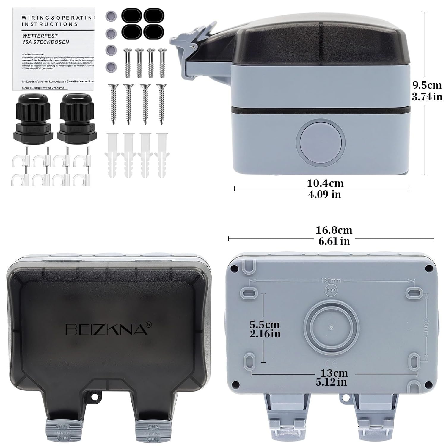 【Enchufe multiusos IP66 para exteriores】 Los enchufes resistentes a la intemperie se utilizan en exteriores para lavanderías, talleres, garajes, jardines, piscinas y aplicaciones comerciales. También se utiliza en interiores para cocina, lavadero, baño y sótano. ACCESORIOS COMPLETOS – 8 tornillos, 4 tapones de expansión, 8 juntas de goma (negras/gris), 2 conectores.