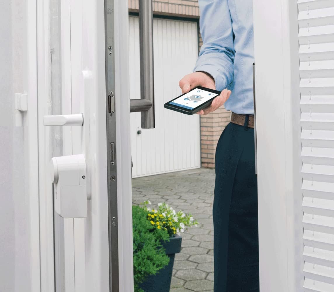 Control de acceso óptimo así como bloqueo de puertas controlado por tiempo con programas de semana flexibles y perfiles de acceso individualesLa aplicación para Apple iOS y Android ofrece control de uno o varios bloqueosSe pueden emparejar hasta 8 teléfonos inteligentes con un solo candadoInstalación inalámbrica gracias al funcionamiento de la bateríaSe puede usar universalmente en todas las puertas con una cerradura de cilindro estándar (la cerradura de cilindro existente debe sobresalir en el interior de la puerta de 8 a 15 mm más que la conexión de la manija)