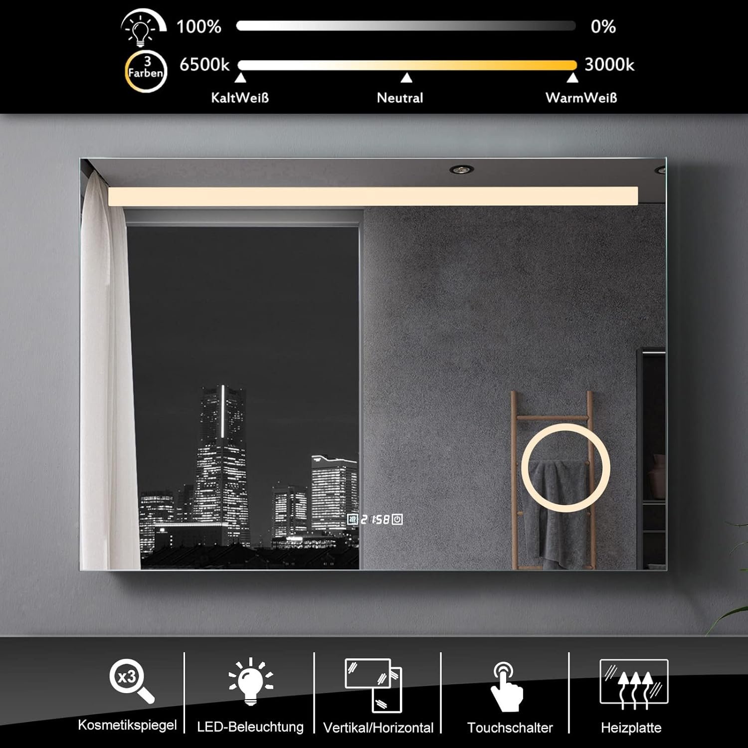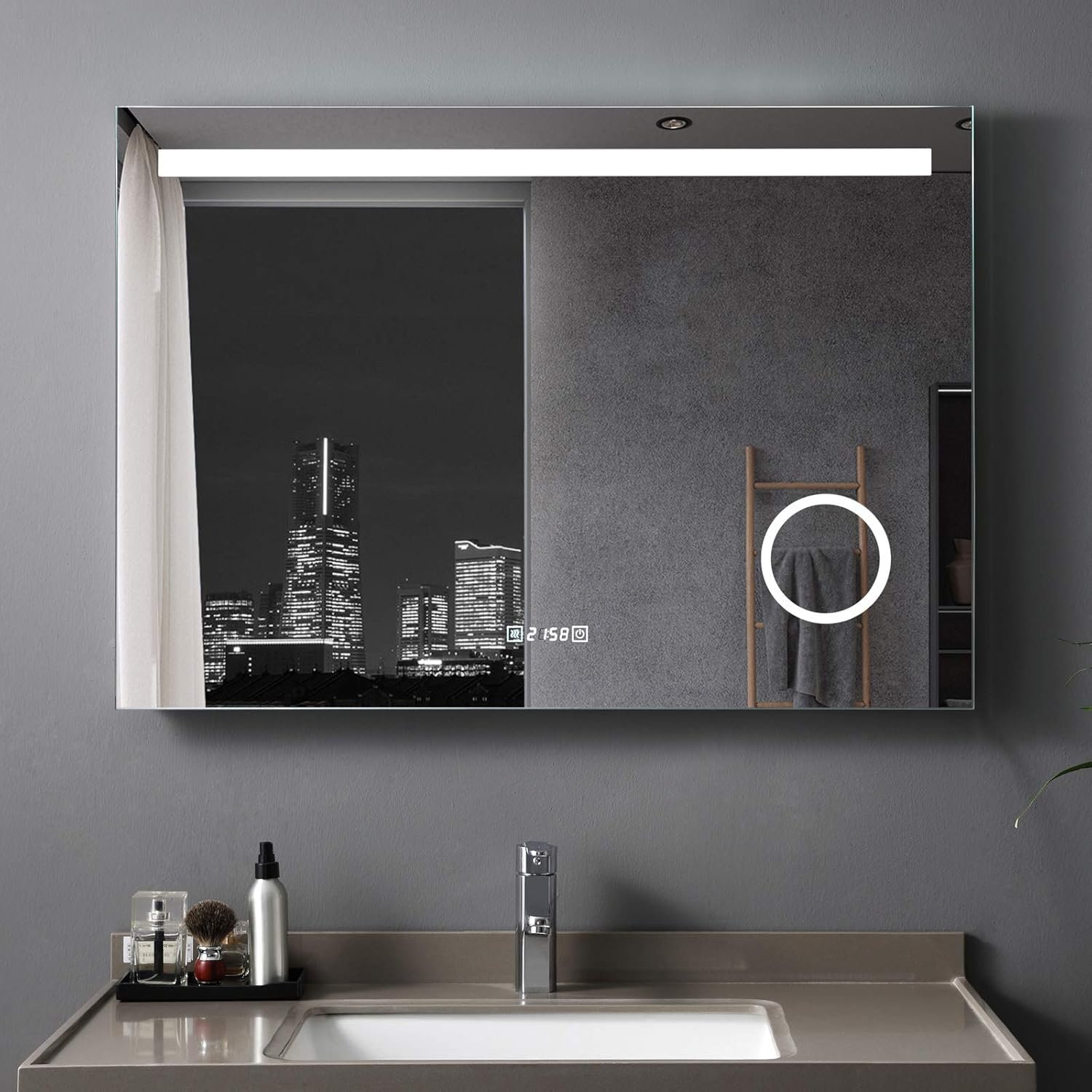 【Reloj y función de aumento】Con el reloj digital, es conveniente controlar mejor el tiempo cuando te lavas, maquillas, con el espejo de aumento de 3 veces, puedes ampliar los detalles más finos, maquillaje, cuidado de la piel o afeitado para observarlos mejor, con una toma de corriente conveniente para usar con otros electrodomésticos.
