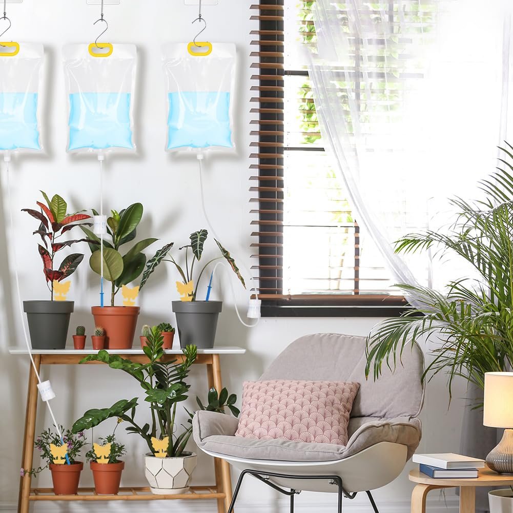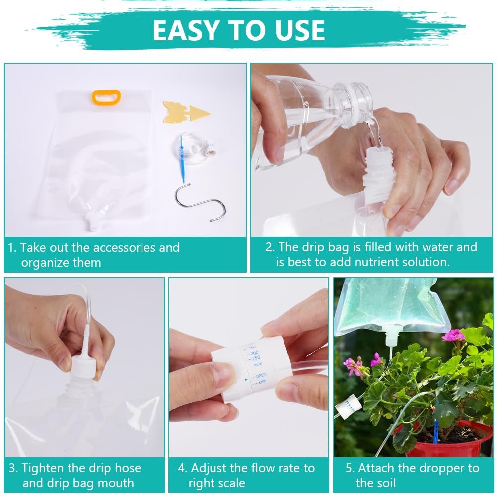 🌷🌷【Diseño de riego por goteo de precisión】Esta bolsa de riego por goteo de por vida está equipada con una válvula de control independiente y precisa para controlar el tiempo de mantenimiento. La bolsa de goteo gotea 5 ml por hora y una bolsa llena puede durar unos 30 días; Instilar 250ml cada hora y se puede utilizar durante unas 14 horas. Es perfecto para sus plantas en macetas de interior y plantas de exterior.