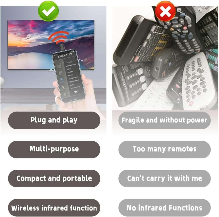–Fuerte señal de control La distancia de transmisión más larga del mini control remoto por infrarrojos para teléfono inteligente es de hasta 15 metros, con una fuerte capacidad antiinterferente.