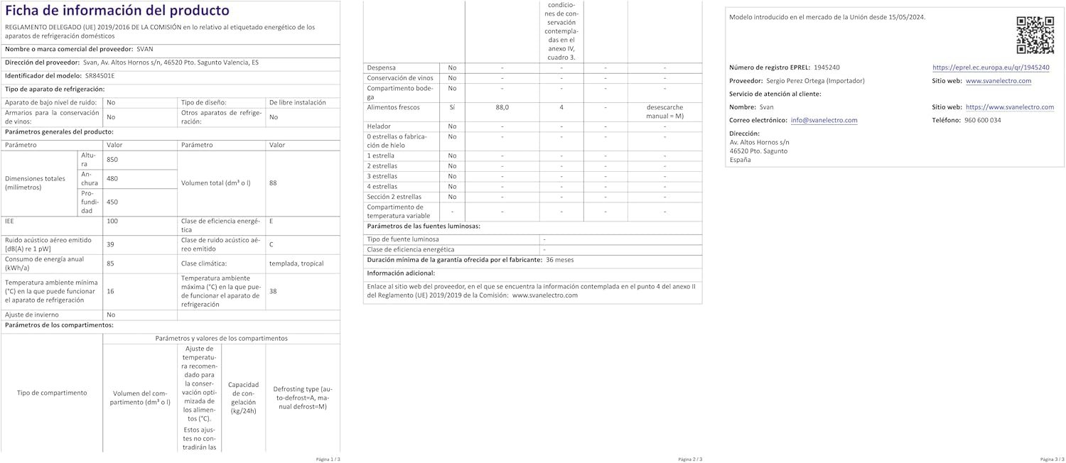 Frigorífico Frigorífico SVAN Blanco SR84501E. Capacidad 88 Litros, Puerta Reversible, Bajo Sonido, Clase de eficiencia energética E