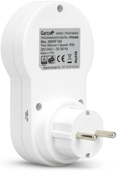La potencia del temporizador digital Garza es de 3680W/ 16a/ 230V/ 50Hz, dispone de funciones de reset/aleatorio, para programar en los formatos de 12H o 24H