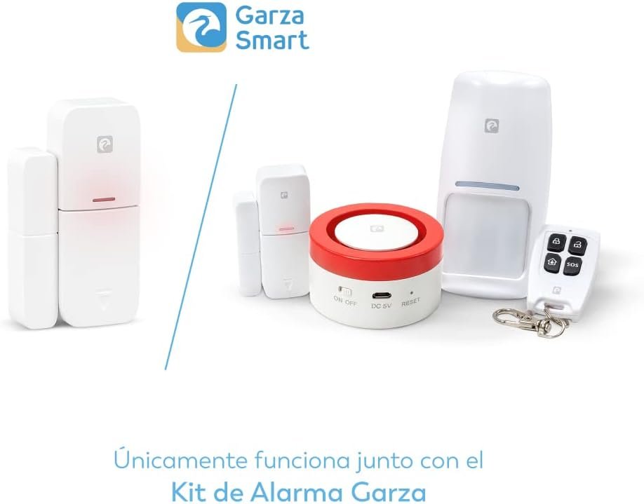2 sensores de apertura de puertas y ventanas autoadhesivos. No es autónomo, sólo funciona junto con el Kit de Alarma Garza Combina diferentes sensores y prográmalos junto con otros dispositivos compatibles como luces, cámaras y enchufes Reciba alertas y active la alarma sonora y visual del Hub como elemento disuasorio Mando a distancia SOS; El mando a distancia compacto permite activar la función SOS entre otras funciones. Funciona con pilas