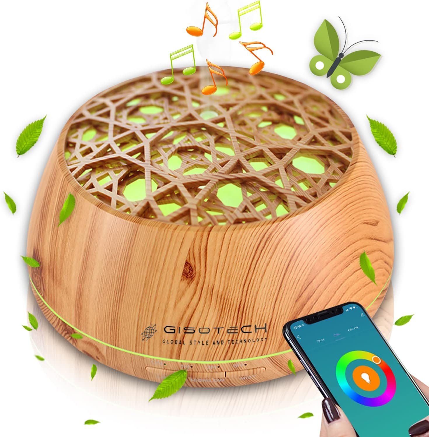 Gisotech Difusor de Aceites Esenciales Alexa 400 ml, Control por App WiFi, Altavoz Bluetooth, Temporizador, 30 Luces LED, Humidificador de Aceites Esenciales, Difusor de Aroma, para Yoga en Casa