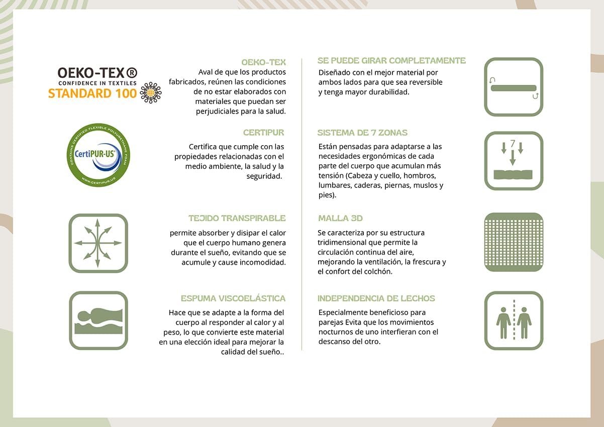 Se sirve envasado al vacío, se recomienda abrir y esperar 24-48 horas a que recupere su forma definitiva. Los colchones pueden tener una variación de espesor de ± 2 cm. Certificado Oeko-tex y Certipur, lo que demuestra una fabricación sostenible y libre de sustancias nocivas. Producto de confianza fabricado en España.