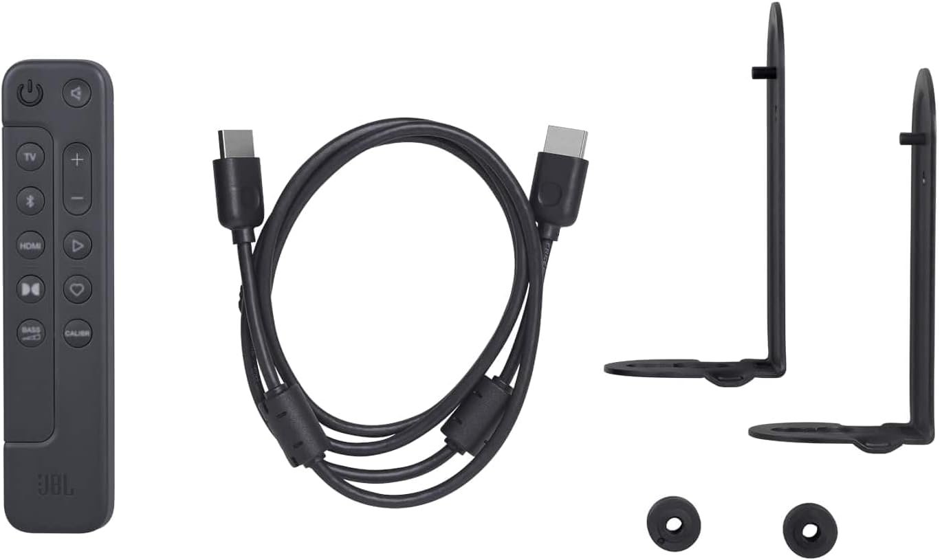 Contenido de la caja: 1 barra de sonido JBL Bar 300, control remoto con 2 baterías, cables de alimentación, cable HDMI, 2 soportes de montaje en pared, guía de instrucciones, hoja de seguridad