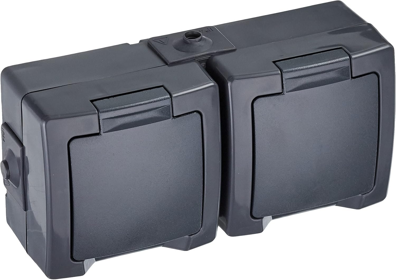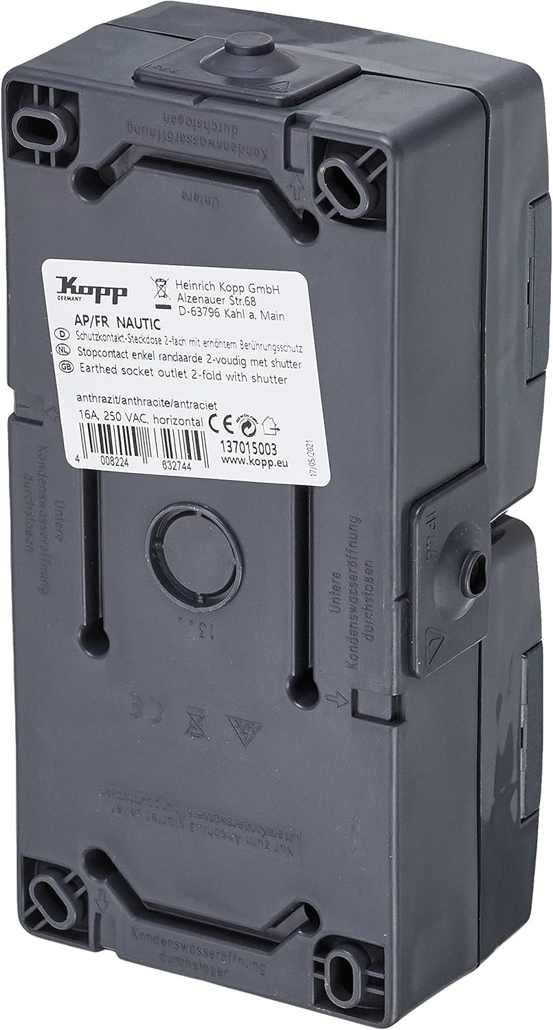 Kopp NAUTIC – Enchufe de 2 Tomas con Tapa Abatible en Antracita – Enchufe Seguro con Mayor Protección Táctil – IP44 Horizontal para Ambientes Húmedos 16A/250V ~