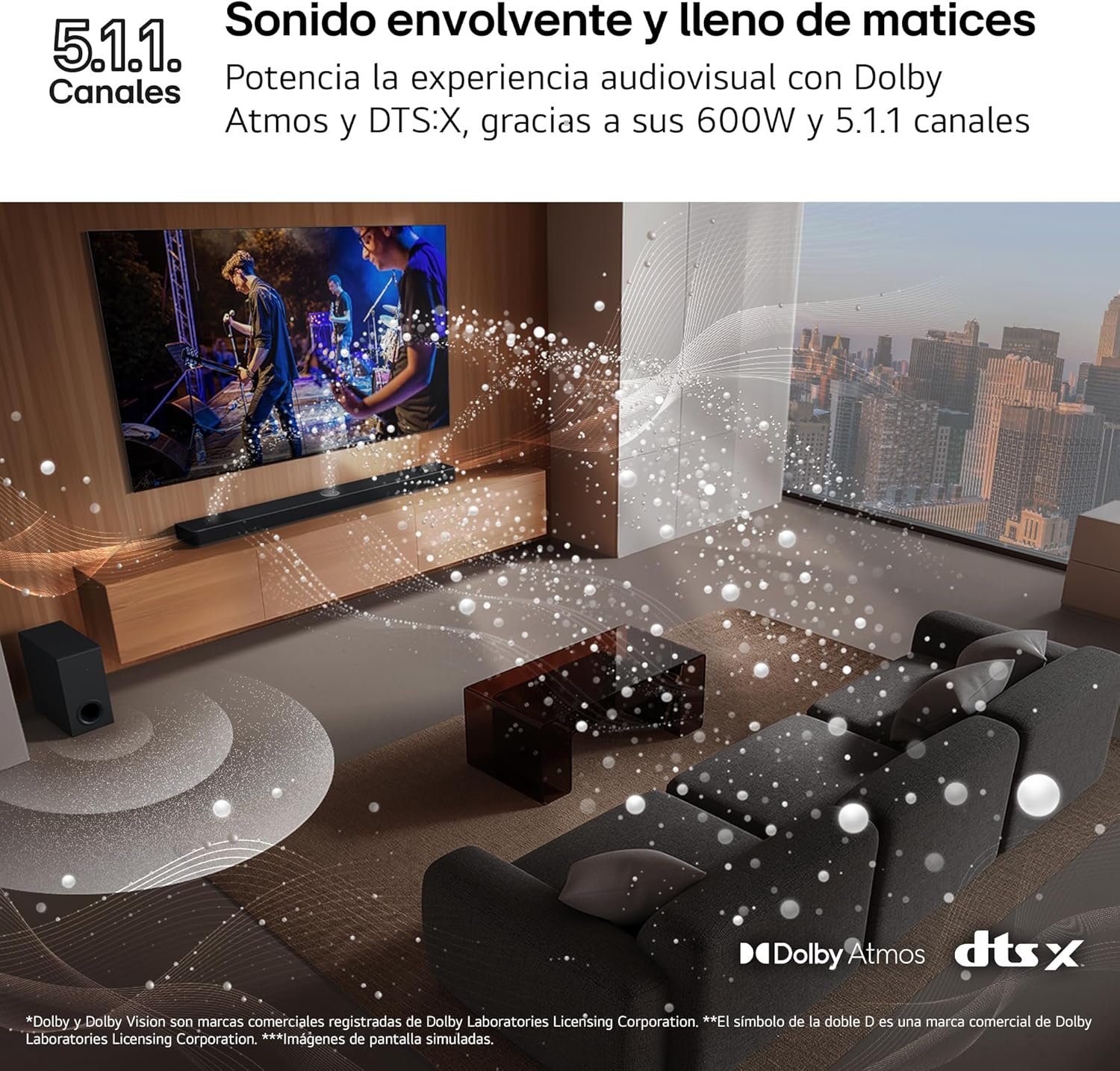 SONIDO ENVOLVENTE DE ALTA CALIDAD Y LLENO DE MÁTICAS: Siente el sonido fluir a tu alrededor gracias al sonido Dolby ATMOS y su altavoz vertical, 500W de potencia omnidireccional. 5.1.1 canales: 3 altavoces frontales, 2 altavoces traseros, 1 subwoofer y 1 altavoz vertical. Dolby Digital y DTS, alta resolución 24 bits/96 kHz