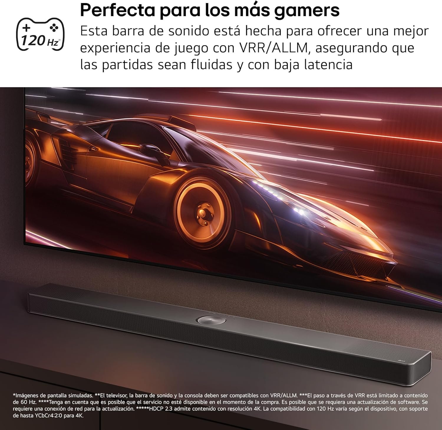 BARRA DE SONIDO DE INTELIGENCIA ARTIFICIAL AI: Sonido inteligente que se adapta a cada contenido optimizando la configuración de audio con AI Sound Pro. Ecualización optimizada para series, películas y música, y sonido fluido para juegos de 120 Hz, con soporte de paso VRR/ALLM.
