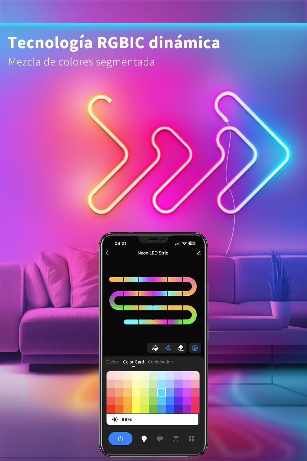 Colores dinámicos RGB+IC: con la tecnología RGB+IC de Beaeet, tu imaginación se expande ilimitadamente. Las tiras LED de neón flexibles tienen más colores y efectos de animación fluidos para hacer que tu decoración sea aún más impresionante.
