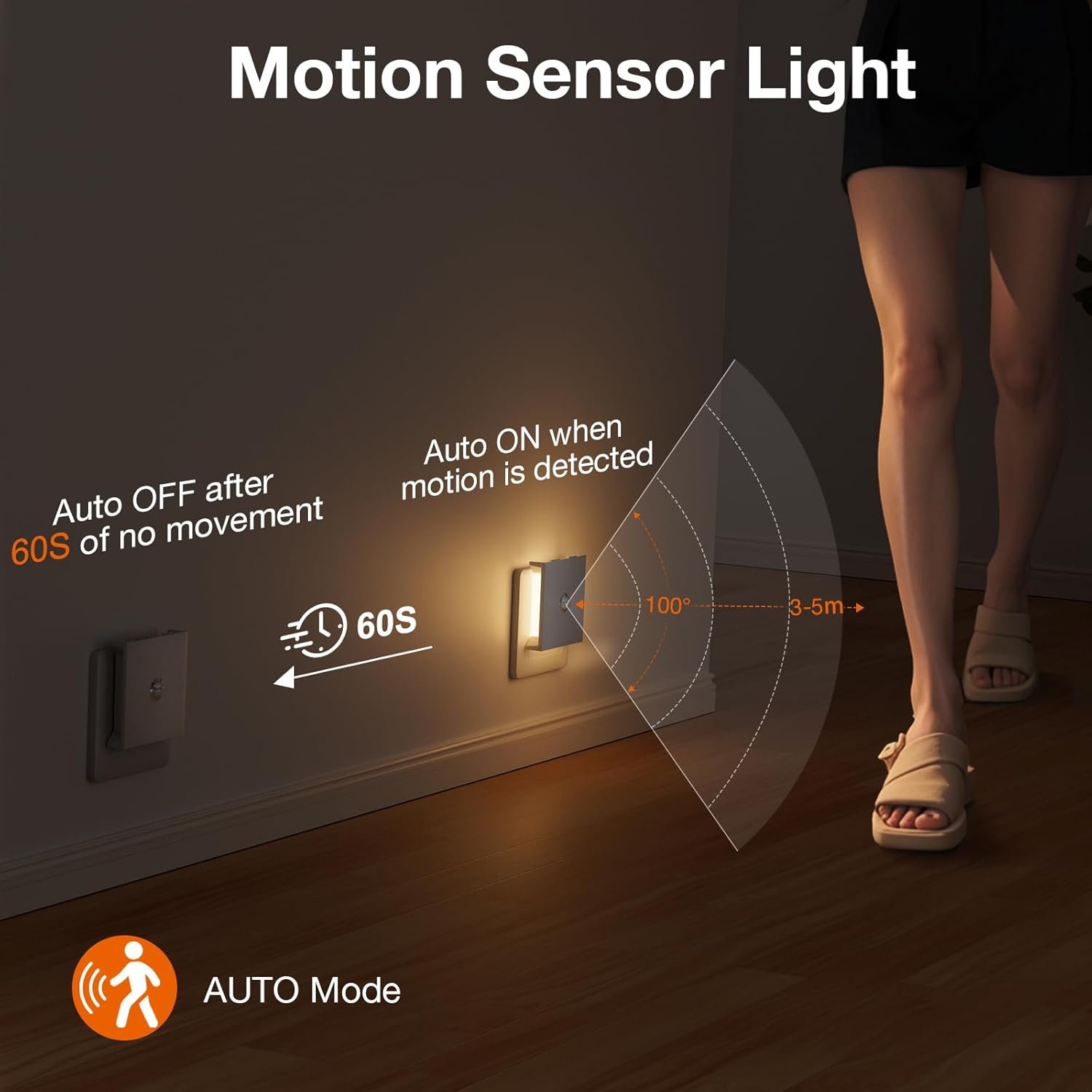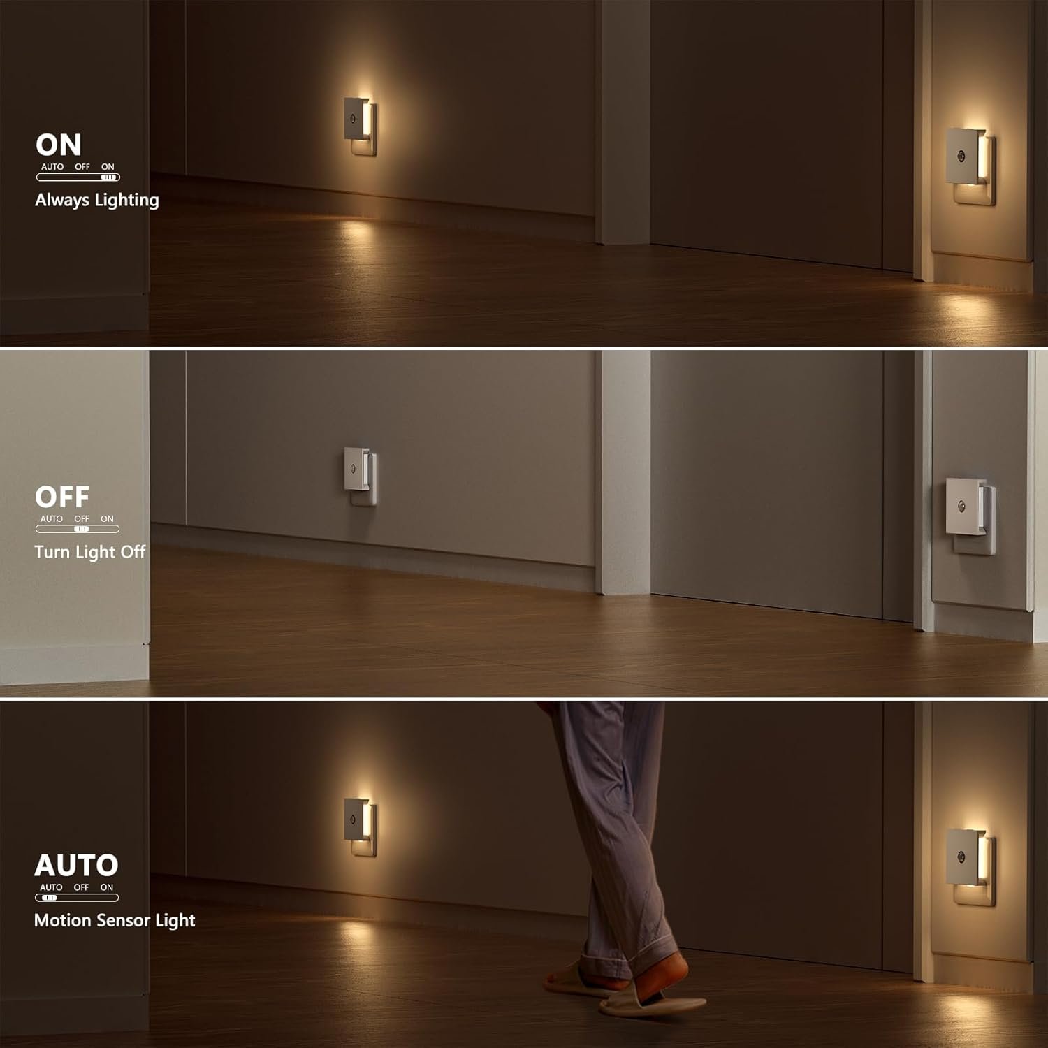 3 modos de luz: Modo ATUO: solo en ambientes oscuros, cuando el sensor de movimiento infrarrojo de la luz nocturna detecta movimientos humanos dentro de 3-5 metros y 100°, la luz nocturna se encenderá y apagará automáticamente si no hay movimiento dentro de 20 segundos. Ya no se detecta movimiento, lo que ahorra energía. Modo ON: La luz nocturna permanece siempre encendida. Modo APAGADO: apaga la luz nocturna