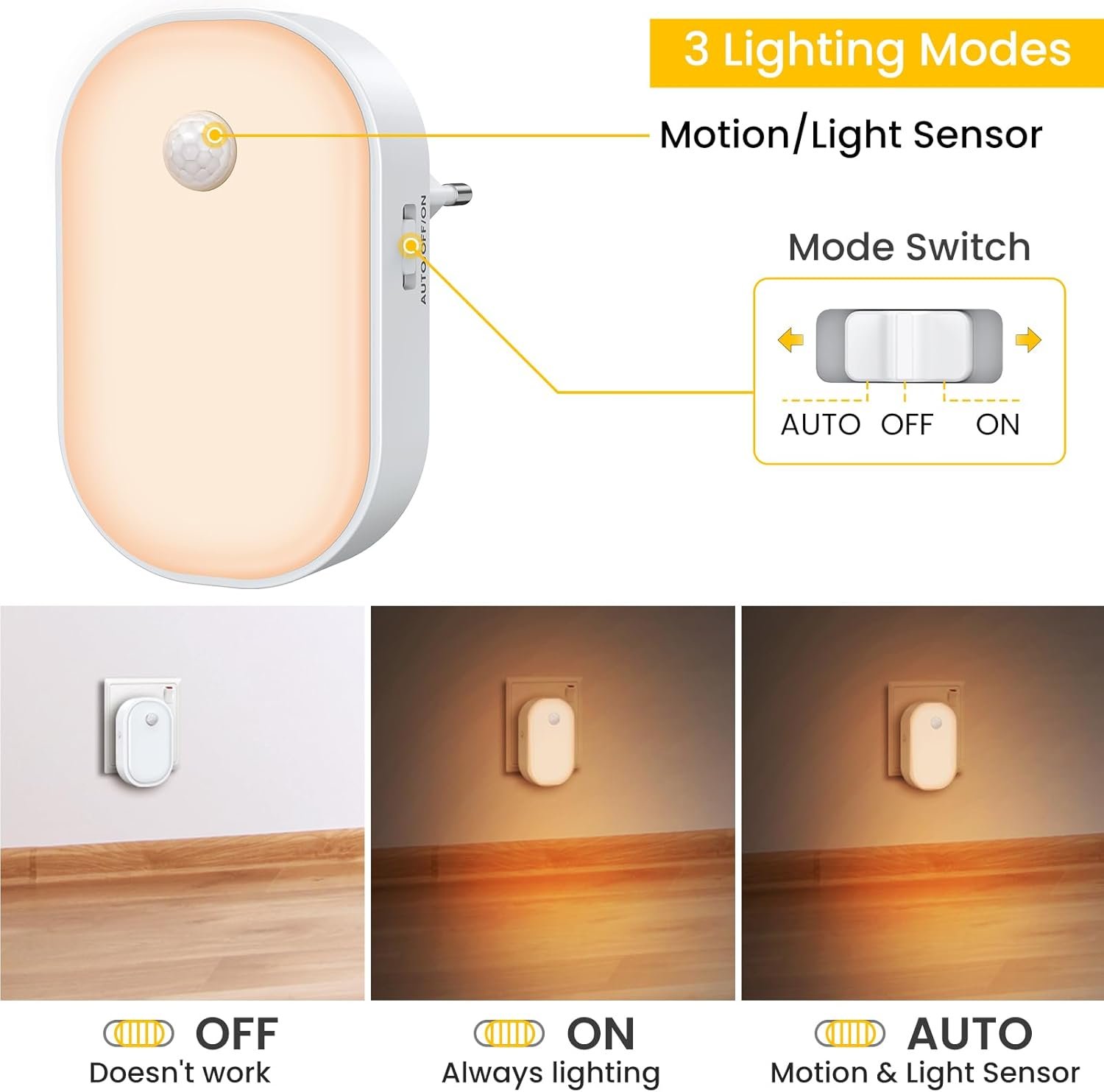 💡【3 Modos de Iluminación】: ☀️ ENCENDIDO: Siempre encendido. ❤【AUTO】Con un sensor crepuscular y un sensor de movimiento, esta pequeña luz nocturna para niños se encenderá automáticamente durante 30 segundos cuando la luz sea tenue o cuando pasen personas o mascotas. El rango de detección es de 4 metros y 120°. APAGADO: Apagar