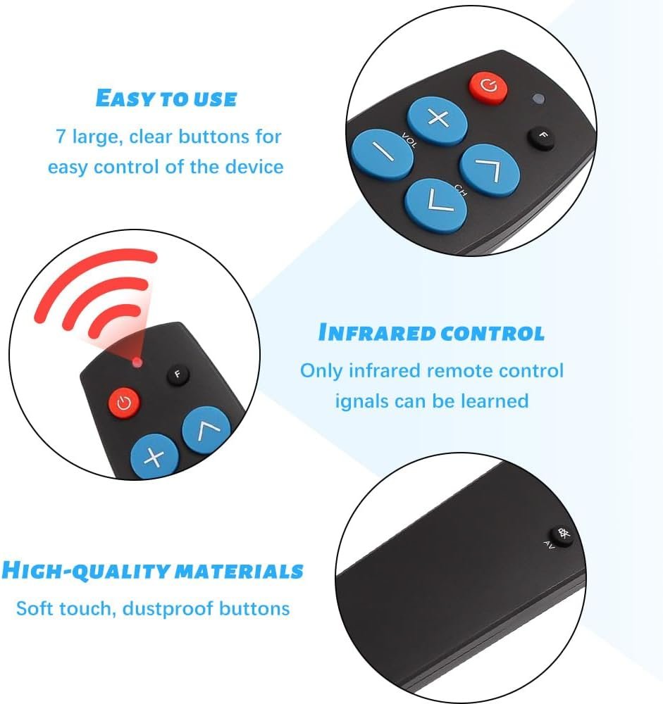 【Un regalo ideal para personas mayores】 El televisor remoto para personas mayores con botones grandes para personas mayores es fácil de usar y tiene funciones completas. El control remoto de aprendizaje universal es un regalo ideal para las personas mayores y les proporciona un control conveniente de los electrodomésticos.