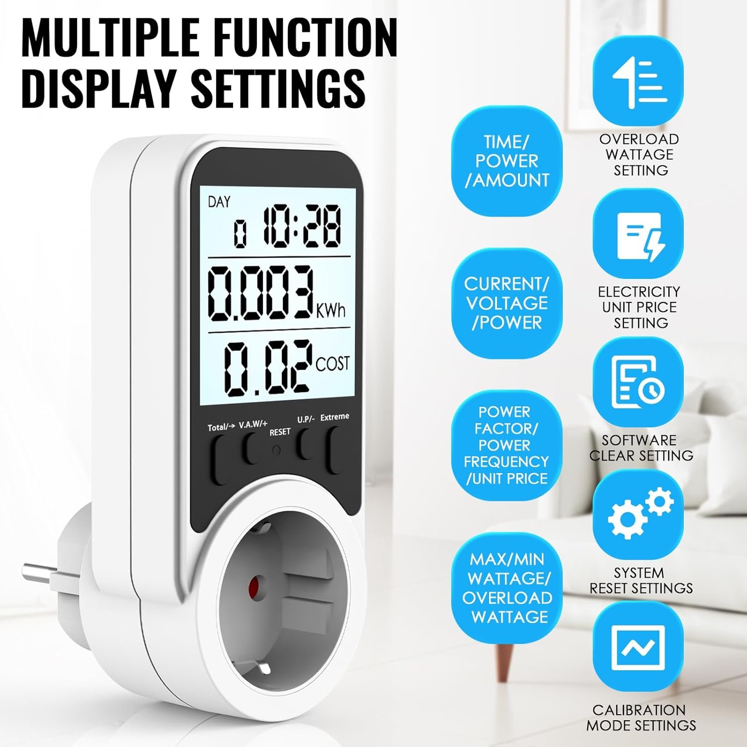 Monitoreo Múltiple: Este medidor de consumo eléctrico de KAEFUYS ofrece 7 modos de monitoreo para que puedas rastrear tu consumo de energía en tiempo real. Mide con precisión el consumo total (kWh), la duración del uso, el voltaje, la potencia, la corriente, el factor de potencia, la frecuencia, el precio unitario de la electricidad, el costo acumulado, la potencia mínima y máxima, así como la potencia de sobrecarga.