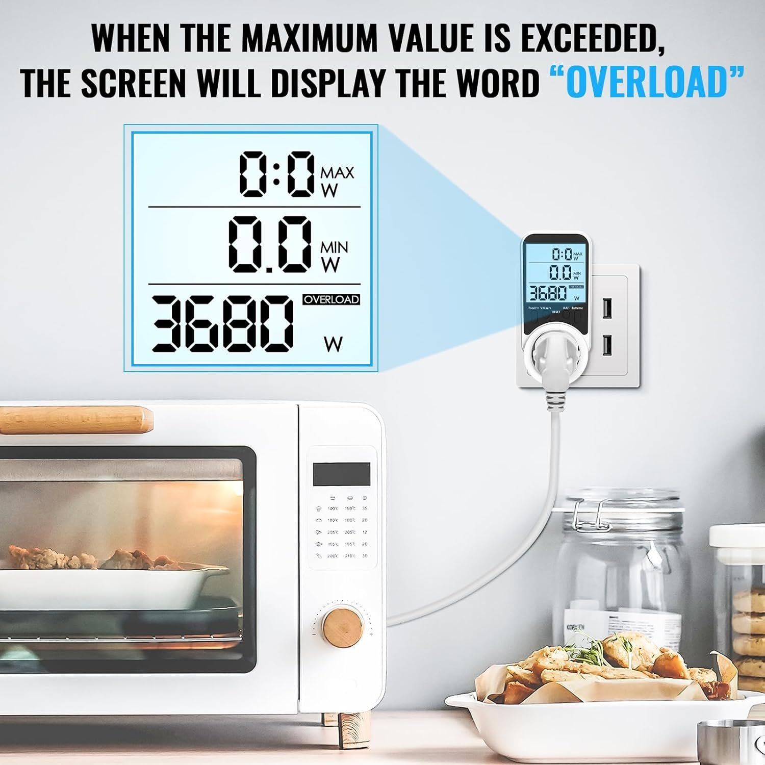 Medidor de consumo eléctrico 3680W/16A Medidor de consumo eléctrico con pantalla LCD 7 modos de monitoreo Protección contra sobrecarga para refrigerador Lavadora TV