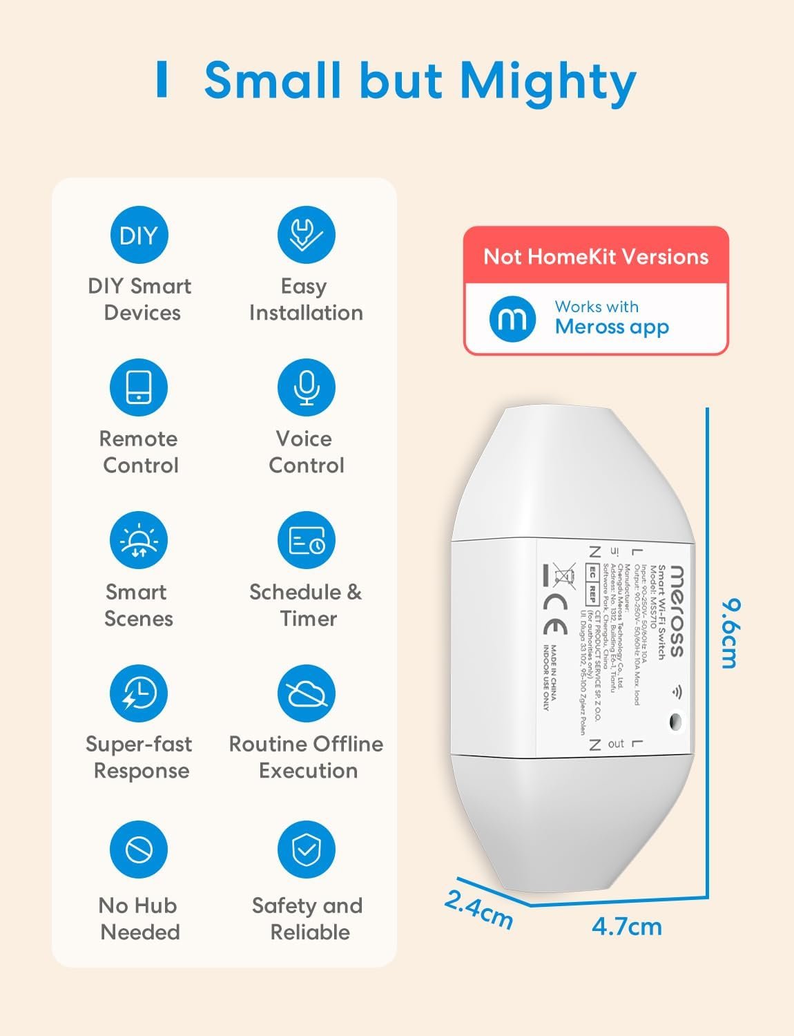 MÓDULO UNIVERSAL 10A: Podrás cambiar los pequeños electrodomésticos de tu hogar de convencionales a inteligentes. Por ejemplo, este pequeño interruptor WiFi permite transformar una lámpara, un ventilador o un calefactor auxiliar en un objeto conectado CONTROL POR VOZ: El interruptor WiFi conectado es compatible con Amazon Alexa, Echo, Echo Dot, Google Assistant, Google Home y Google Nest, puedes encender o apagar tus dispositivos mediante comando de voz CONTROL REMOTO: Enciende o apaga los dispositivos conectados desde cualquier lugar a través de un teléfono inteligente (iOS y Android) con la aplicación Meross, sin restricciones de distancia con Acceso a Internet. No se necesita centro HORARIO Y AHORRO DE ENERGÍA: El interruptor universal conectado evita que te olvides de apagar tus dispositivos. Ajusta el horario de funcionamiento de tus electrodomésticos según tus necesidades, para evitar pérdidas de energía innecesarias FÁCIL INSTALACIÓN: Podrás conectar el interruptor inteligente con tus electrodomésticos en menos de diez minutos. Solo necesitas presionar e insertar los cables. El interruptor conectado se puede utilizar con la mayoría de los electrodomésticos.