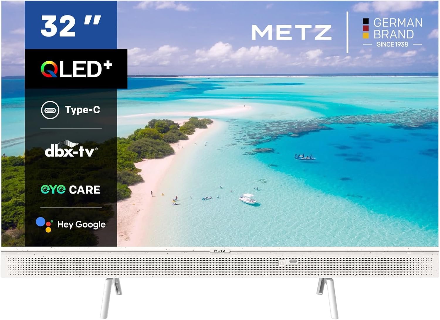Metz Smart TV QLED Portátil de 32 Pulgadas, 32MQE7100Z Google Television, HD, HDR10, 2x10W Potentes Altavoces Frontales, DBX, Dolby Audio, USB-C, Chromecast, Funciona con Google Assistant, Blanco, 80 cm