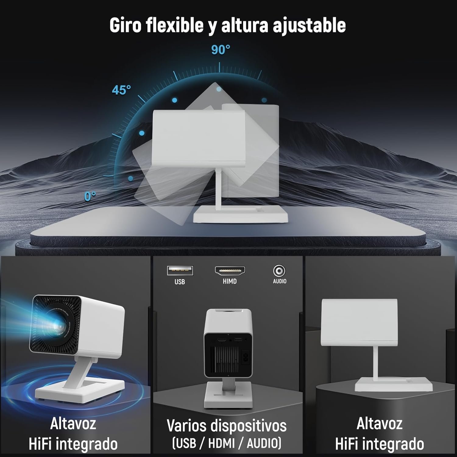 Rotación de 180°, ajuste de altura, soporte plegable, proyección en techo, diseño compacto y liviano: Este mini proyector incorpora un soporte ajustable con rotación de 180°, que permite una cómoda visualización tanto sentado como acostado. Ofrece una distancia de proyección de 1 a 4 metros y un tamaño de pantalla de 40 a 130 pulgadas, adaptándose fácilmente a presentaciones de cine en casa o de oficina. Su diseño ultraligero y plegable de sólo 500 gramos, con tamaño de palma lo hace compacto y fácil de transportar o almacenar. Se puede instalar sin dificultad en ambientes como oficina, salón, dormitorio, aula o incluso al aire libre.