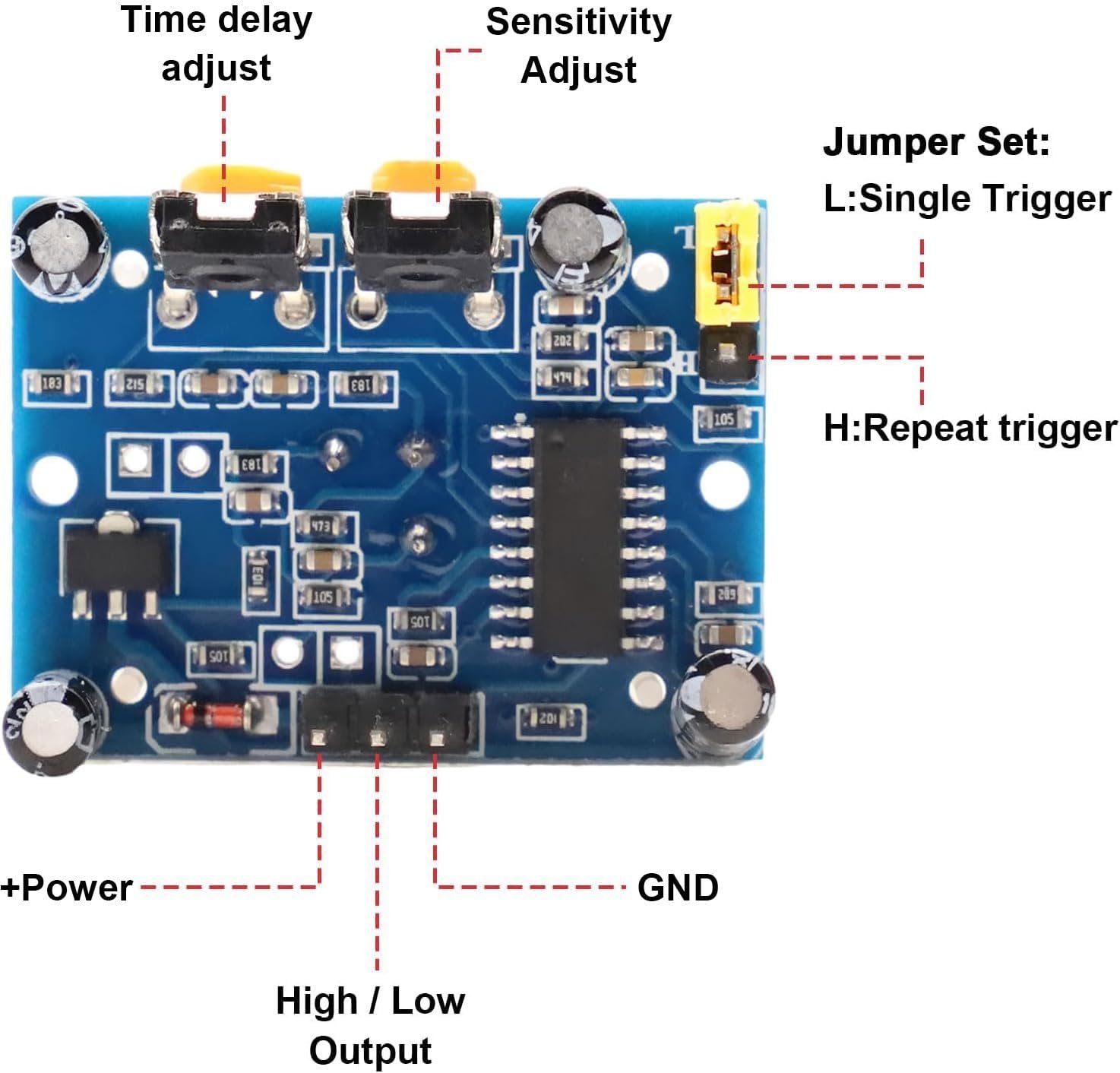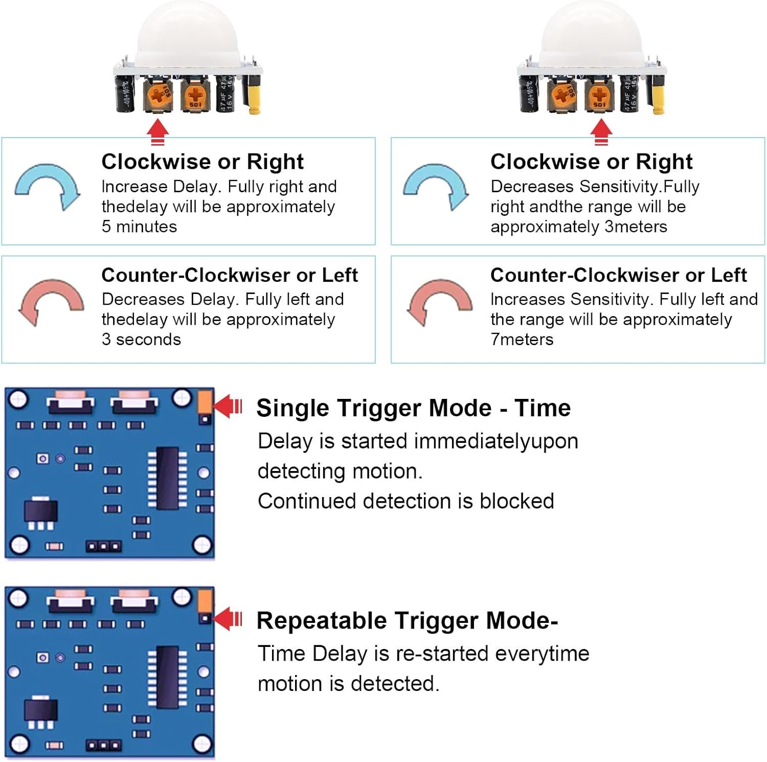 Funciones: Con diseño de sonda importado, que tiene alta sensibilidad y confiabilidad. Sensor de infrarrojos con tablero de control. Se pueden ajustar la sensibilidad y el tiempo de espera. Método de disparo: L no se puede disparar repetidamente, H se puede activar repetidamente (predeterminado: disparador repetido). Tiempo de retardo: 0,5 a 200 S (ajustable), el rango es (0,xx segundos a décimas de segundo). Tiempo de bloqueo: 2,5 s (predeterminado), se puede configurar en un rango (0,xx segundos a décimas de segundo). Amplia aplicación: para iluminación automática en pasillos, baños, sótanos, almacenes, garajes, etc., ventilación automática por extractor y más. Presupuesto: Voltaje: CC 4,5-20 V Corriente estática: <50uA Temperatura de funcionamiento: -15 a 70 grados Celsius Ángulo de detección: ángulo del cono <100°. Distancia de detección: dentro de 7 metros Tiempo de bloqueo: 2,5 s (predeterminado) Tiempo de retardo: 0,5 a 200 s (se puede ajustar, estándar 5 s +-3 %) Método de disparo: L: disparador no repetible/H: disparador repetible (estándar). Diámetro de la lente de inducción: 23 mm / 0,91 pulgadas. Tamaño del artículo: 32 x 24 mm / 1,2 x 0,94 pulgadas. Paquete 6 módulos de sensores PIR Detección de movimiento: Módulo PIR para detección de movimiento compatible con RPi y Arduino COMPATIBLE CON TODAS LAS TARJETAS – Rango de voltaje de funcionamiento: 4,5 V – 20 V con casi todas las placas electrónicas y microcontroladores, compatible con RPi, Arduino, RN Control y Banana Pi Ajuste sencillo y preciso: sensibilidad y tiempo de conmutación ajustables, también para funcionamiento independiente sin ancho de µC Aplicaciones: el módulo de detección de movimiento PIR se puede utilizar debajo de gabinetes, escaleras, pasillos, garajes, baños, pasillos exteriores, etc. para controlar el interruptor de las luces nocturnas. El paquete incluye: 6 sensores infrarrojos PIR
