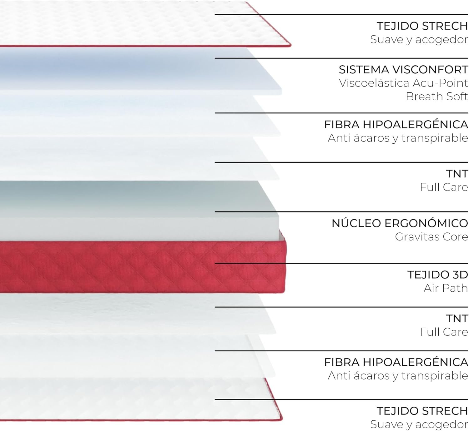 TEJIDO ELÁSTICO: Se adapta perfectamente al contorno haciéndolo mucho más cómodo y agradable. Además, también ofrece una alta transpirabilidad generando un paso continuo de aire, lo que consigue que el colchón visco esté siempre bien ventilado y libre de ácaros, humedad y malos olores.