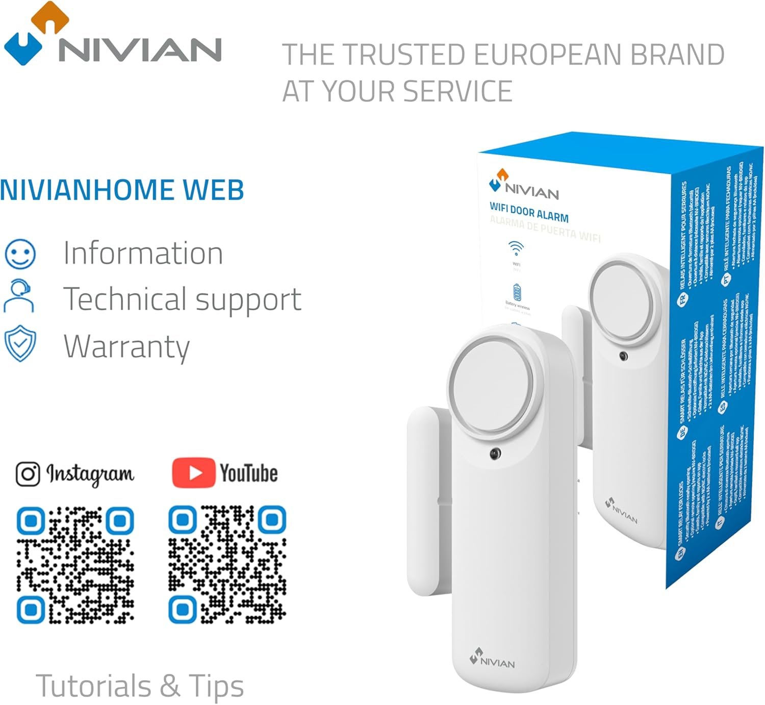 Imagínese tener control total de la seguridad de su hogar, esté donde esté. NIVIAN Smart Door Alarm combina tecnología WiFi, diseño inalámbrico y notificaciones en tiempo real para que siempre sepas lo que sucede en tu puerta. Sin complicaciones, sin cables y con un diseño compacto que se integra en cualquier espacio. Instalación instantánea, sin cables ni herramientas Coloca el sensor en tu puerta con cinta de doble cara y comienza a proteger tu hogar en minutos. Perfecto para apartamentos, viviendas, oficinas o locales comerciales. Control total desde la aplicación móvil Arma o desarma la alarma, establece horarios de entrada y salida y recibe alertas inmediatas cuando la puerta se abre o se cierra. Todo el control a tu alcance. Sirena de 100 dB para máxima seguridad Ante cualquier intrusión mientras la alarma está activada, la potente sirena incorporada se activa automáticamente, alertando a todos y disuadiendo a los intrusos. Notificaciones inteligentes y seguimiento continuo Reciba información en tiempo real sobre el estado de su puerta, notificaciones de intrusión y alertas de batería baja, para mantener su hogar siempre bajo control. Seguridad flexible para toda la familia Botón de desarmado manual para quienes no usan la aplicación, capacidad de compartir el acceso con familiares o empleados y un elegante diseño de ABS blanco que se adapta a cualquier entorno. Por qué elegir Nivian: tecnología WiFi de 2,4 GHz para una conexión estable. Sensor magnético preciso y confiable. LED de estado para un control visual rápido. Diseño compacto y discreto. Ideal para uso en interiores, temperatura 0~40 ℃ y humedad <80%. INSTALAR EN SEGUNDOS, SIN CABLES: diseñada para cualquier usuario, la alarma de puerta NIVIAN se instala fácilmente con cinta adhesiva de doble cara, sin necesidad de herramientas ni técnicos. Conéctate a WiFi y protege todo en minutos. Control total desde tu móvil: activa y desactiva la alarma desde la aplicación, configura horarios de entrada y salida y recibe notificaciones instantáneas cuando se abre o cierra la puerta, estés donde estés. Protección activa con sirena potente: la alarma incluye una sirena de 100 dB que se activa contra cualquier intrusión mientras está armada, alertando a todos y disuadiendo a posibles intrusos. NOTIFICACIONES Y SEGUIMIENTO INTELIGENTES: reciba alertas en tiempo real sobre el estado de la puerta y cualquier evento de seguridad, manteniendo su hogar bajo control sin importar la distancia. Seguridad sencilla para todos los usuarios: botón de desarmado manual para quienes no usan la aplicación, capacidad de compartir el acceso con familiares o empleados y diseño compacto de ABS blanco que se integra en cualquier entorno.