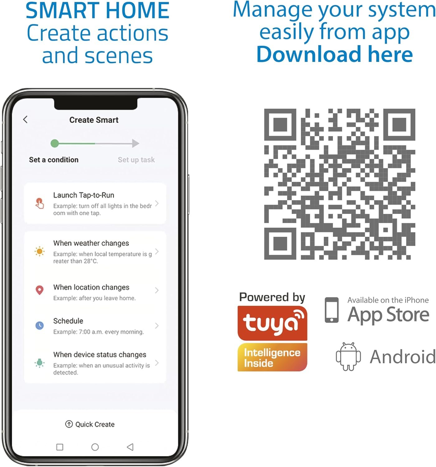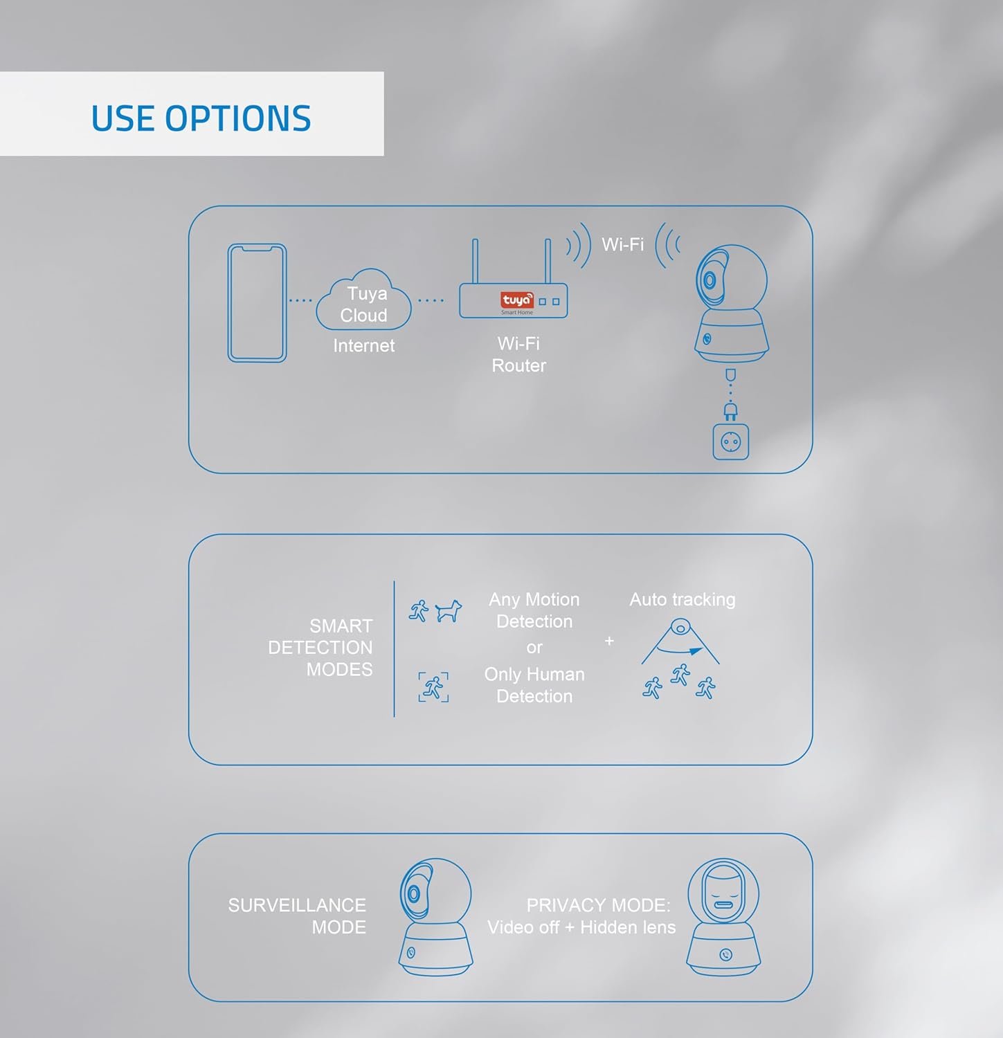 Compatibilidad con asistente de voz y protección de datos avanzada Integre la cámara con Alexa o el Asistente de Google para ver imágenes en vivo desde televisores inteligentes o dispositivos compatibles. Controla todo con tu voz o desde la aplicación Tuya (Android/iOS). Notificaciones instantáneas por pérdida de conexión o intentos de sabotaje. Instalación rápida mediante código QR y protección de datos garantizada mediante cifrado.
