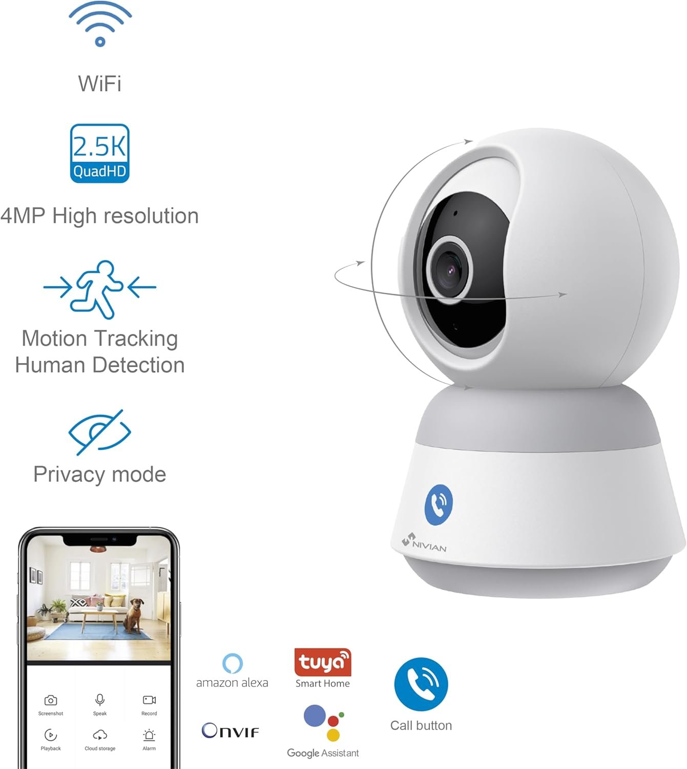 NIVIAN Cámara de Vigilancia Interior Domo 360°, WiFi 4MP Super HD, Detección Humana AI, Seguimiento Automático, Audio Bidireccional, Compatible con Alexa y Google Home