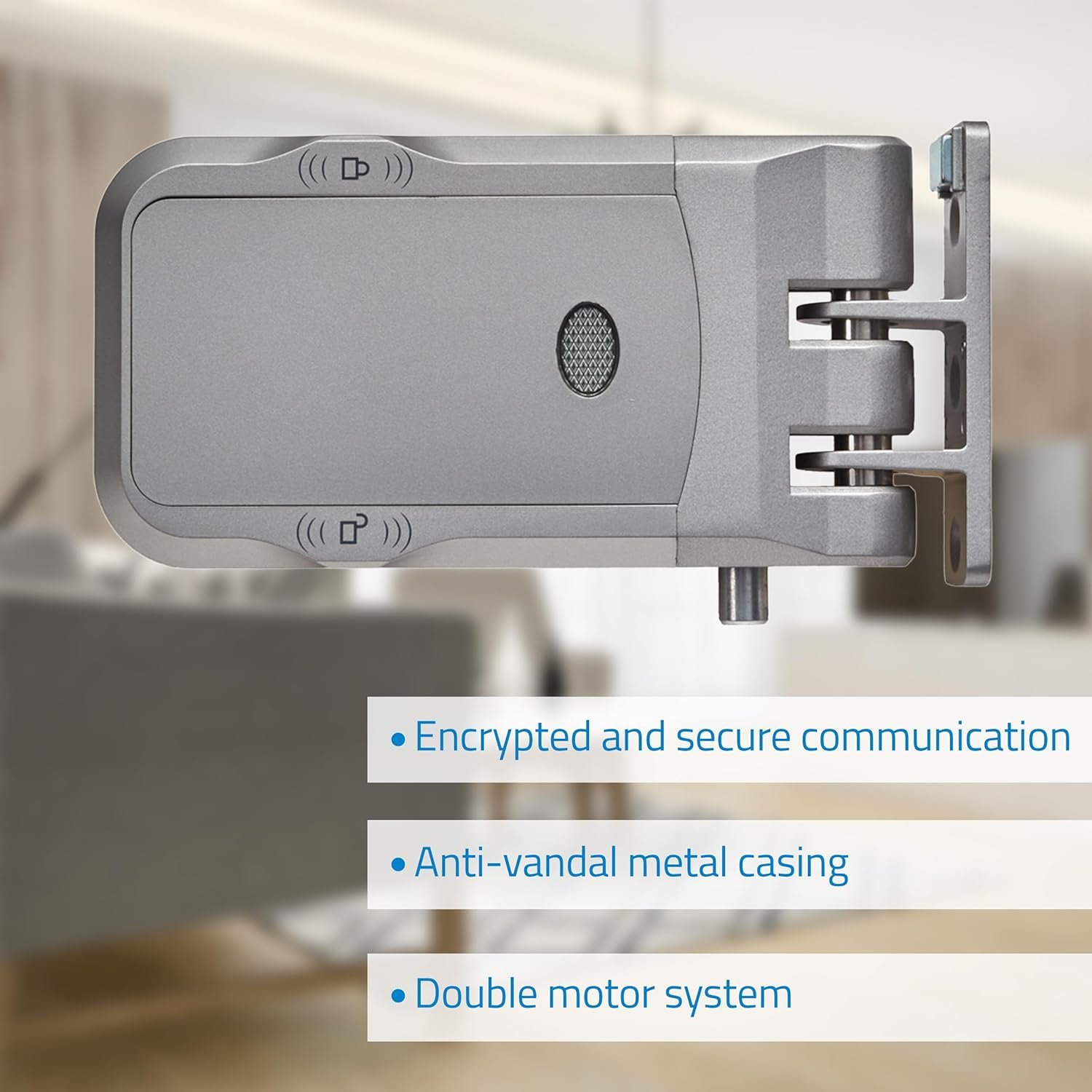 Sistema antivandálico de doble motor y carcasa metálica duradera Gracias a su robusta carcasa metálica reforzada y sus potentes pasadores de acero, esta cerradura antivandálica NIVIAN ofrece una protección superior contra intentos forzados. El doble motor interno asegura un cierre automático preciso y silencioso, adaptándose a diferentes tipos de puertas. Ideal como cerradura de seguridad adicional o como sistema principal de acceso a caja fuerte sin necesidad de sustitución del cilindro.