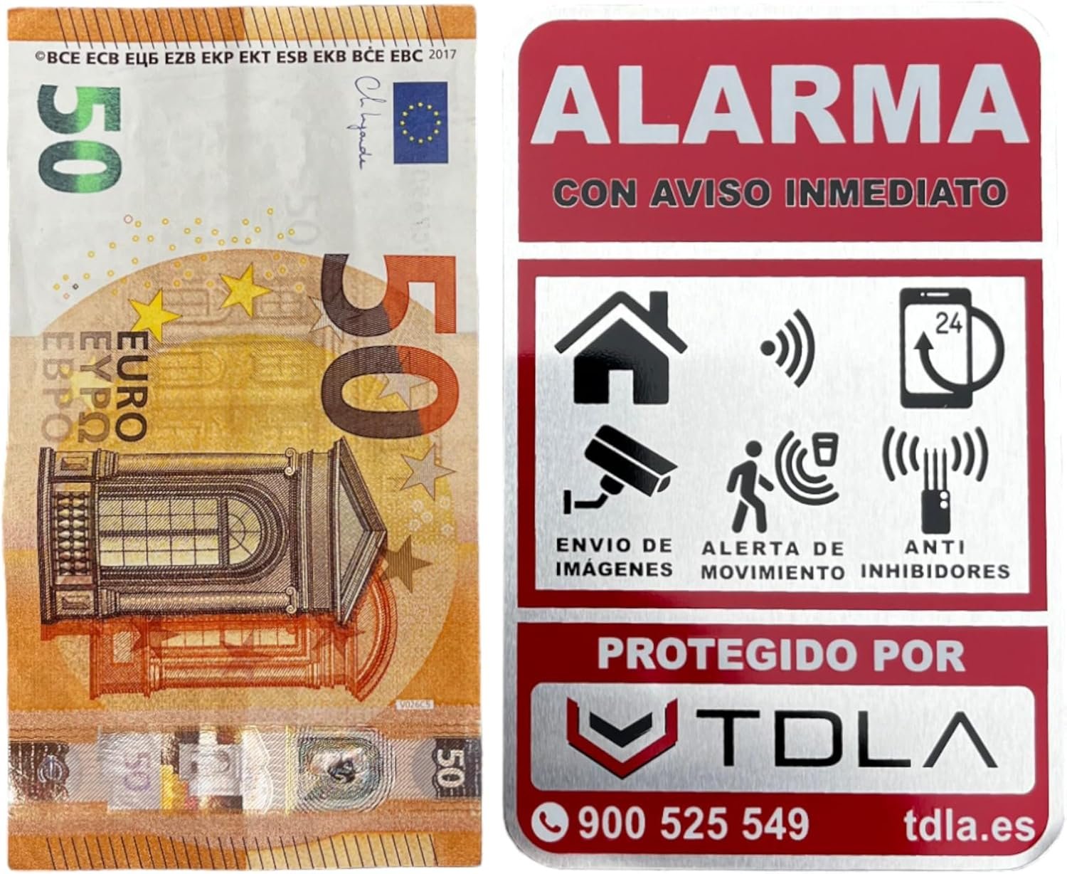 Pero esas placas chinas que ponen policía son absurdas y no sólo no ahuyenta a nadie sino que hace darse cuenta al delincuente de que lo más probable es que ni siquiera haya un sistema de alarma. Billete como referencia de tamaño.